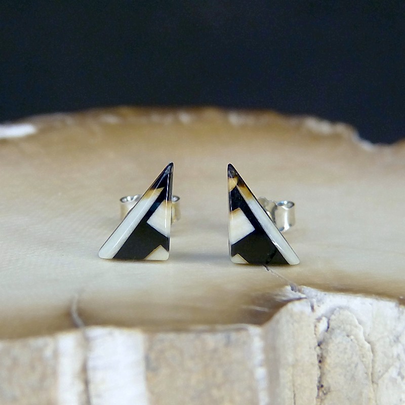 Kleine dreieckig geschliffene Ohrstecker aus Mammut-Elfenbein mit schöner Zeichnung. Sie haben eine Größe von ca. 10 x 5,5 mm und sind mit einer gut einrastenden Steckermechanik aus 925/-er Silber gearbeitet.