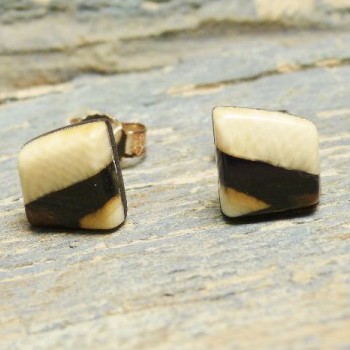 Eckig geschliffene Ohrstecker aus cremefarbenem und dunkelbraunem Mammut-Elfenbein mit feiner Maserung. Sie haben eine Größe von ca. 8 x 8,5 mm und sind mit einer Steckermechanik aus 925/-er Silber gearbeitet.