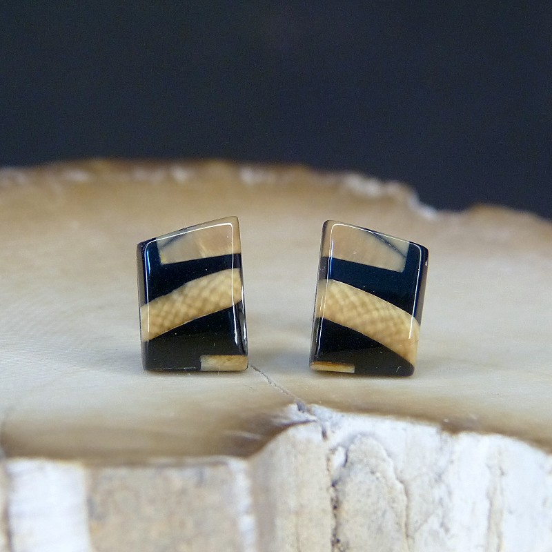 Kantig geschliffene Ohrstecker aus braunem Mammut-Elfenbein mit ausgeprägter Maserung. Sie haben eine Größe von ca. 8 x 11 mm und sind mit einer gut einrastenden Steckermechanik aus 925/-er Silber gearbeitet.