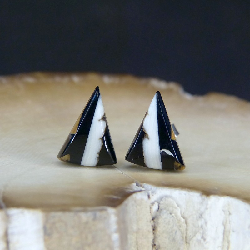 Dreieckig geschliffene Ohrstecker aus weißem und braunem Mammut-Elfenbein. Sie haben eine Größe von ca. 12,5 x 10 mm und sind mit einer gut einrastenden Steckermechanik aus 925/-er Silber gearbeitet.