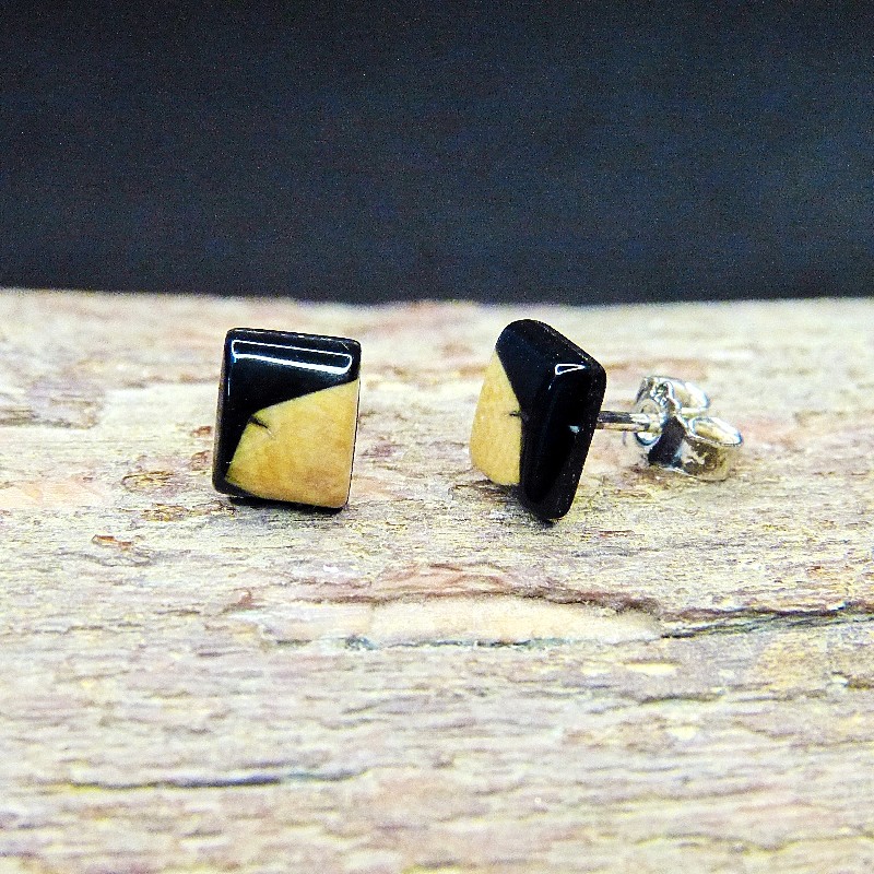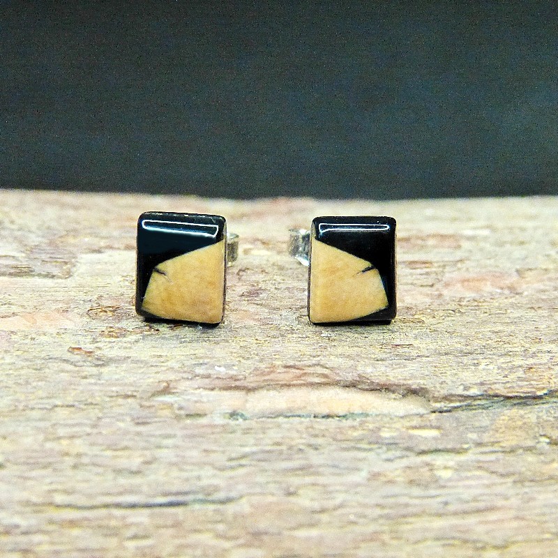 Kantig geschliffene Ohrstecker aus bräunlichem Mammut-Elfenbein mit feiner Maserung.