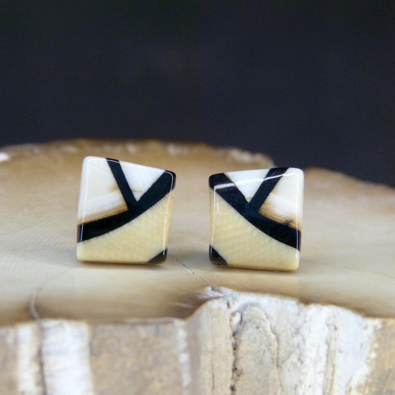 Kantig geschliffene Ohrstecker aus hell/cremigem Mammut-Elfenbein mit schöner Maserung. Sie haben eine Größe von ca. 13 x 11,5 mm und sind mit einer gut einrastenden Steckermechanik aus vergoldetem 925/-er Silber gearbeitet.