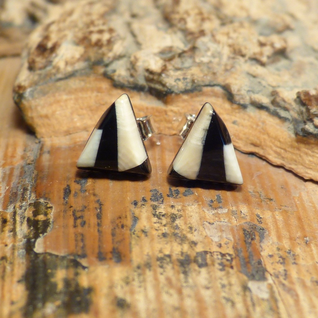 Schwarz/weiß Ohrstecker in Dreieckform geschliffen. Die Größe ist ca. 9 x 8,8 mm mit Stecker in Silber 925/-