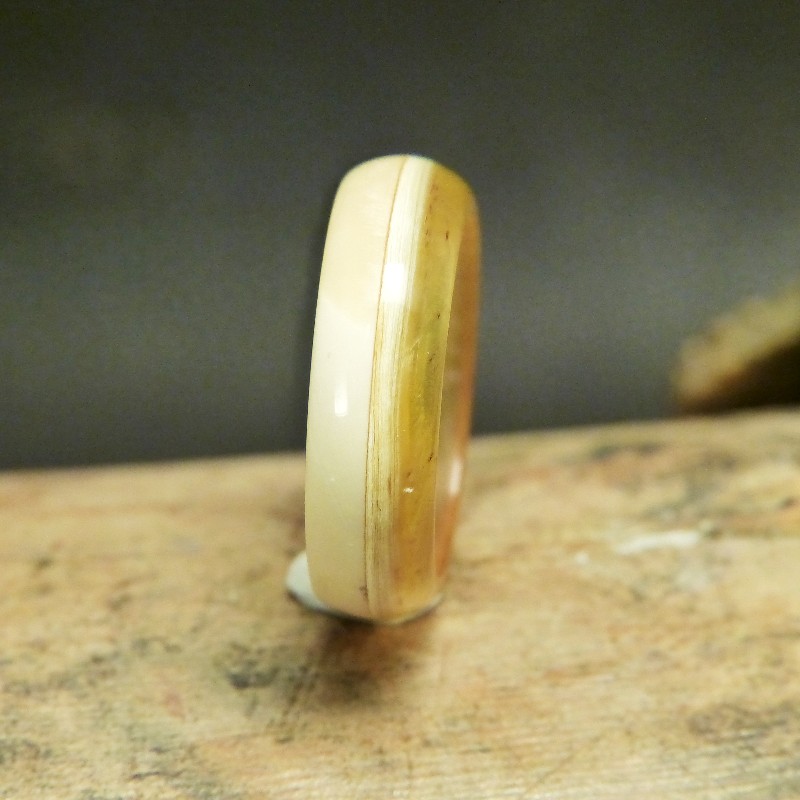 Schmaler Bandring aus cremibem Mammut-Elfenbein, kombiniert mit melliertem Büffelhorn. Er hat eine Breite von ca. 6,5 mm bei einer Weite von ca. 18,1mm.