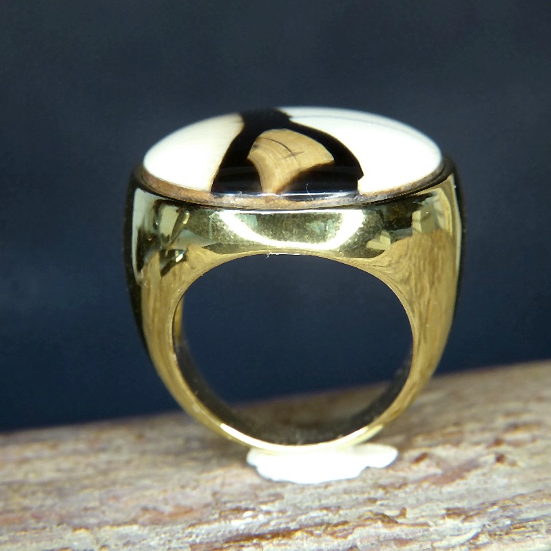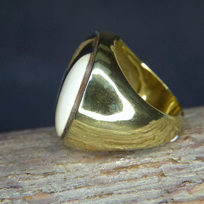 Sehr schöner und auffälliger Ring aus Edelstahl mit hochwertiger IP-Vergoldung und einer Einlage aus cremefarbenem und braunem Mammut-Elfenbein. Der gesamte Durchmesser beträgt ca. 27 mm, die Ringweite beträgt ca. 20 mm