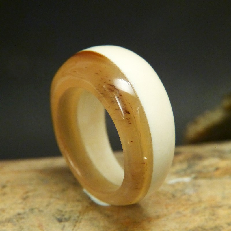 Kuppenring aus Mammut-Elfenbein mit feiner Maserung, kombiniert mit hellem Büffelhorn. Er hat eine Breite von ca. 12,5 mm bei einer Weite von ca. 18,5mm die auf Wunsch bis auf W 19,1 geändert werden kann.