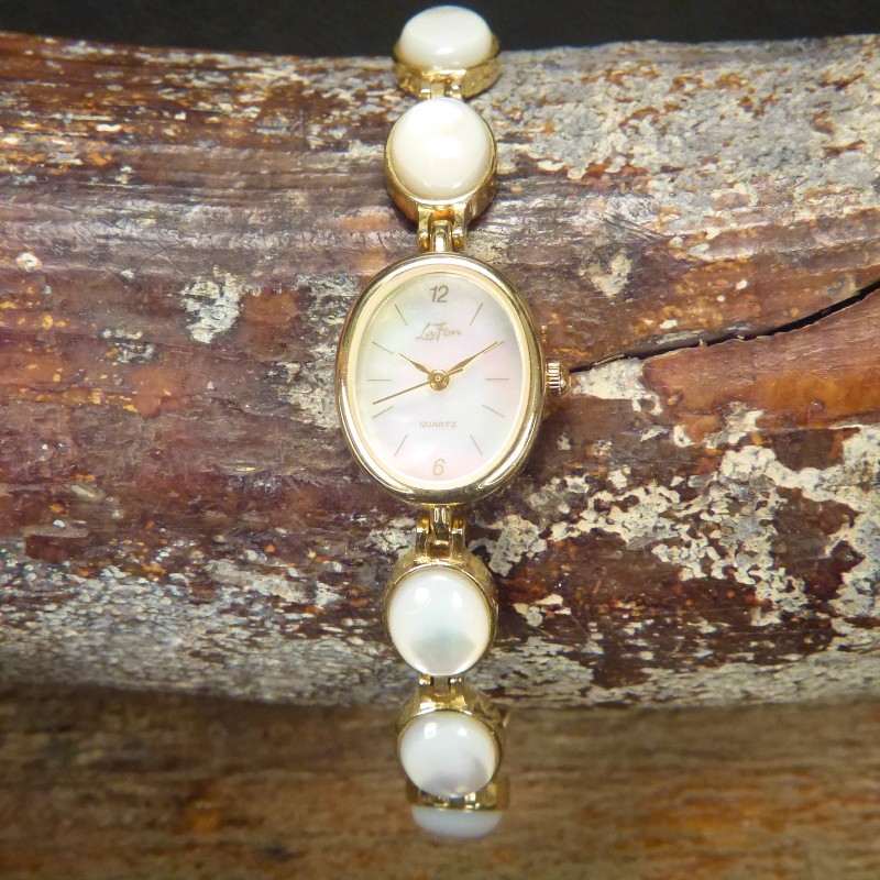Armbanduhr mit einzelnen Gliedern, belegt mit 8 Cabochons aus schimmerndem Perlmutt.