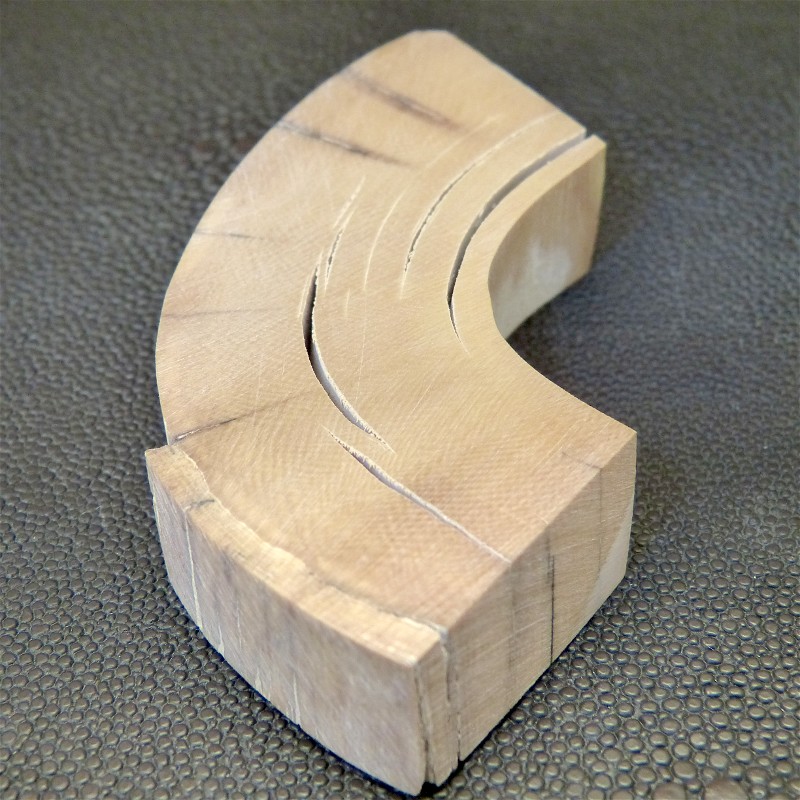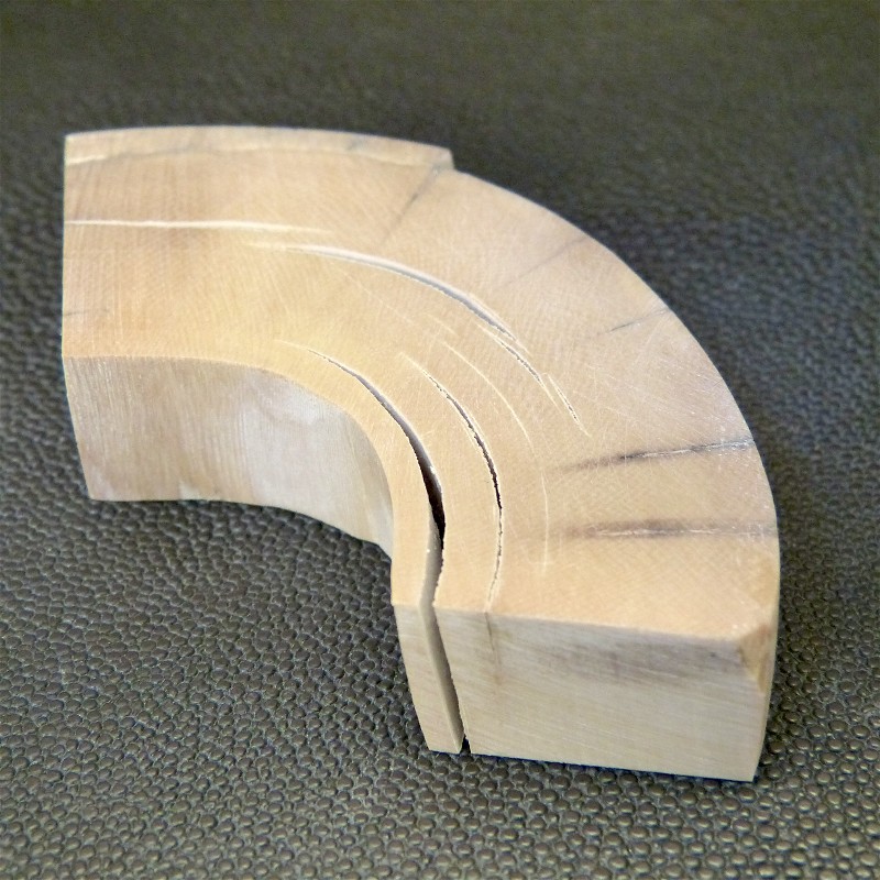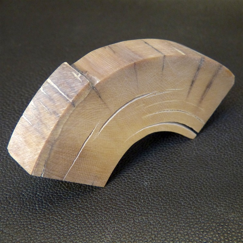 Sie erhalten einen bogenförmigen Abschnitt eines bräunlichen Mammutzahns mit schöner Maserung in trockener Qualität und diversen Bogenrissen. (Siehe Fotos)