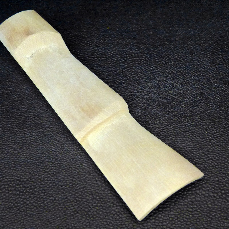 Abschnitt aus cremig geflecktem Mammut-Elfenbein mit zwei Rissbildungen an den Abstufungen.