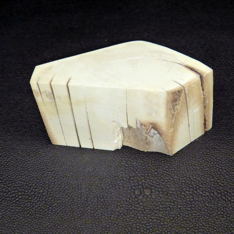 Abschnitt aus hellem Mammut-Elfenbein mit teilweisen Färbungen und diversen Rissbildungen.