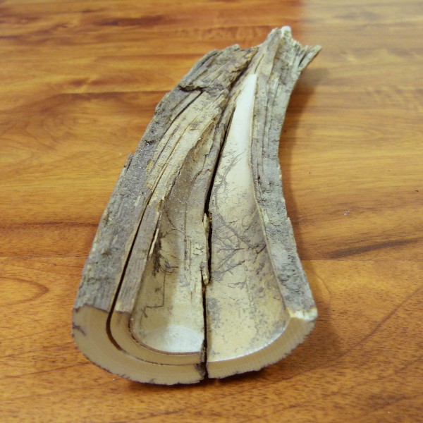 Ca. 30 cm langes Rindenstück vom Mammutzahn mit einer Breite von ca. 7 cm. Schön zu erkennen ist der konische Aufbau des Zahns, der durch die einzelnen Wachstumsschübe entstanden ist. Gut zur Schmuckherstellung geeignet.