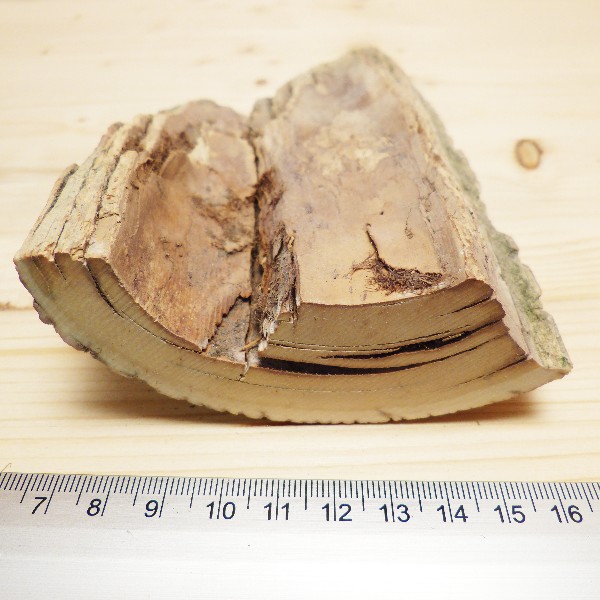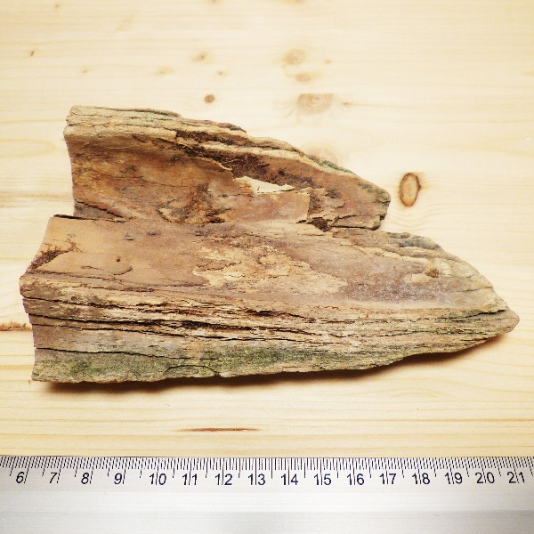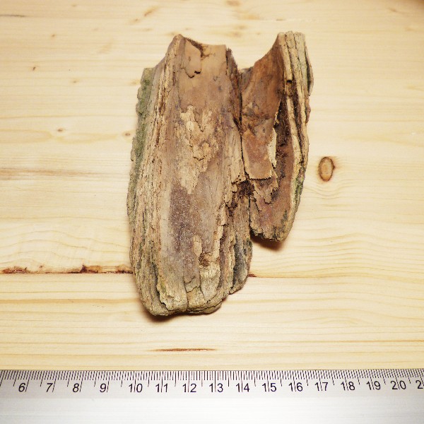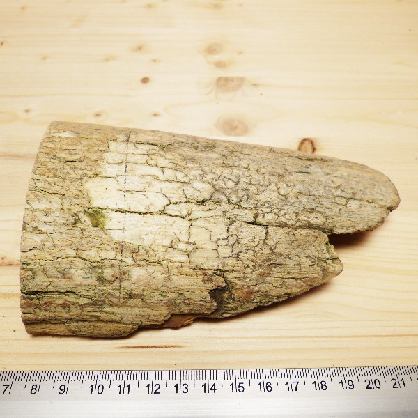 Schönes Mammutstück vom Zahnende mit grober Rinde. Es hat eine Länge von ca. 16 cm und eine Breite von ca. 10 cm. Die Dicke an der einen Seite misst ca. 34 mm, an der Anderen ca. 10 mm.