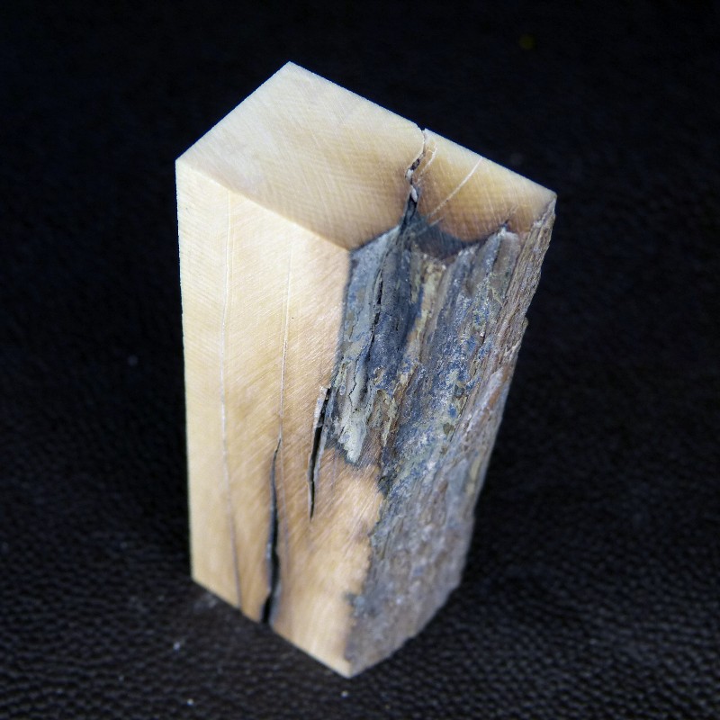 Sie erhalten einen Block aus Mammut-Elfenbein mit Rinde und diversen Rissbildungen in trockener Qualität. (siehe Fotos)