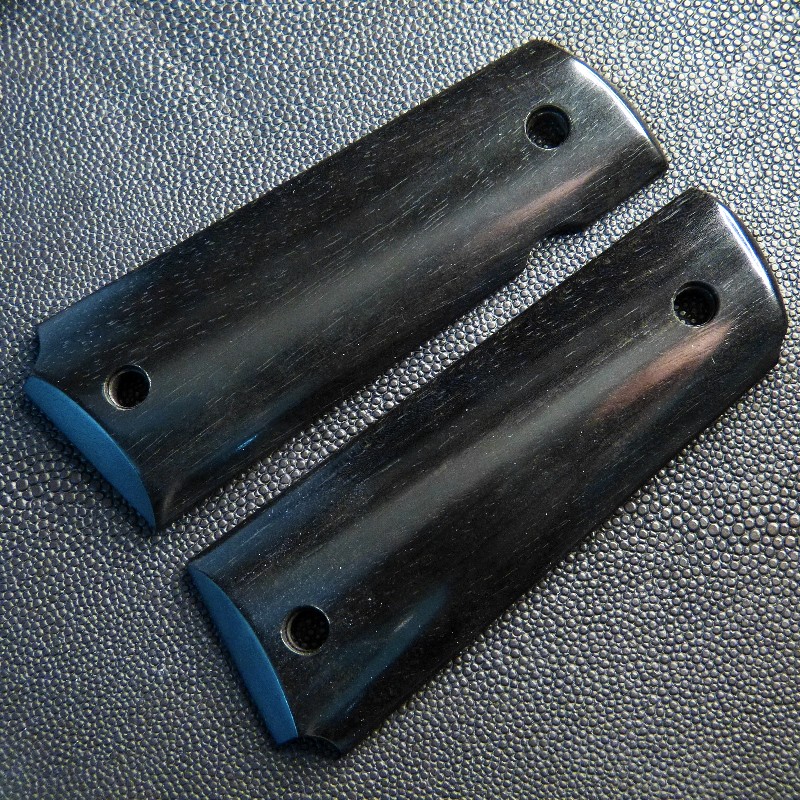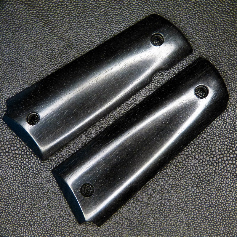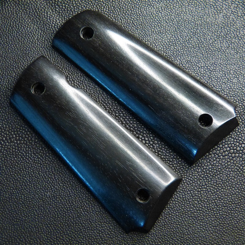 1 Paar von Hand gefertigte Griffschalen aus schwarzem Ebenholz mit polierter Oberfläche, passend für 1911er Pistolen. Stärke ca. 7 mm.