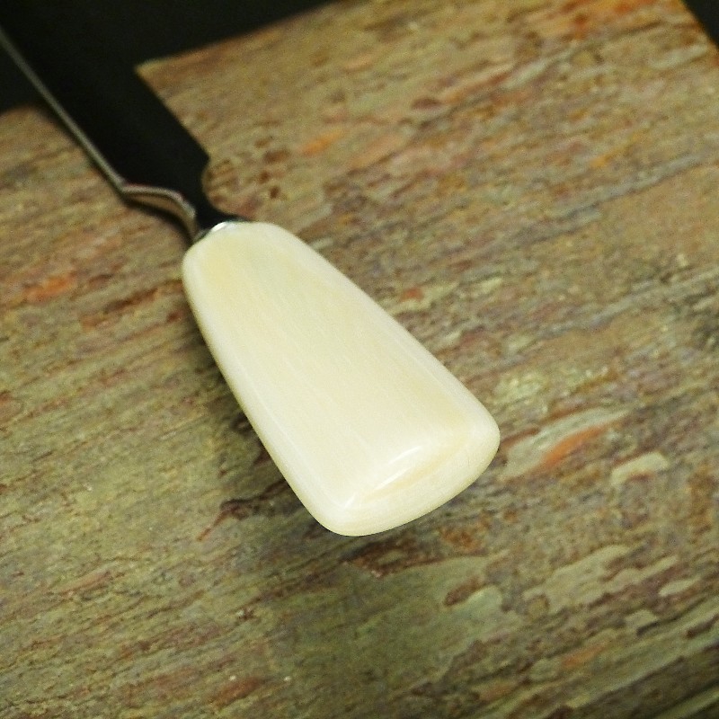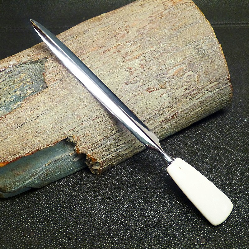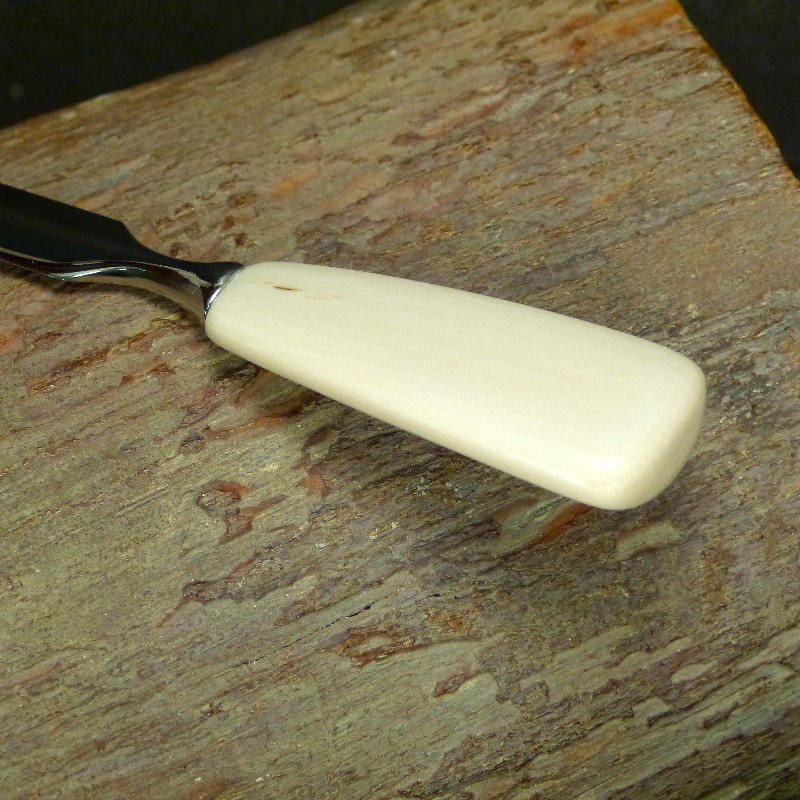 Brieföffner aus silberfarbigem Metall, "Made in Solingen". Der Griff wurde aus fossilem Mammut-Elfenbein mit cremiger Färbung gefertigt.