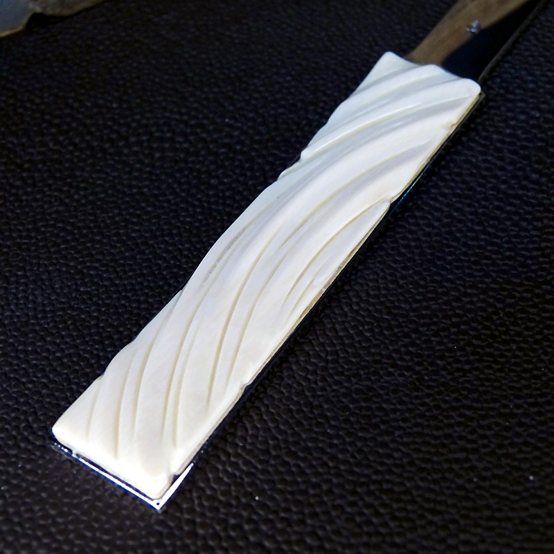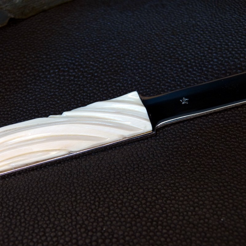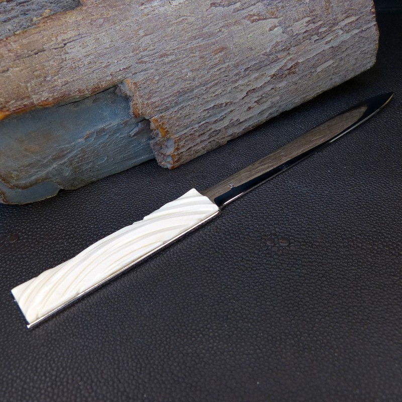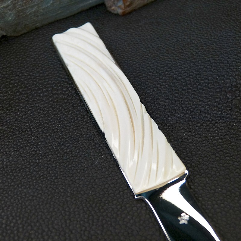 Großer Brieföffner aus silberfarbigem Metall, "Made in Solingen", belegt mit hellem beschnitztem Mammut-Elfenbein.