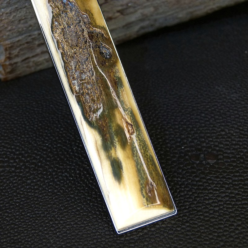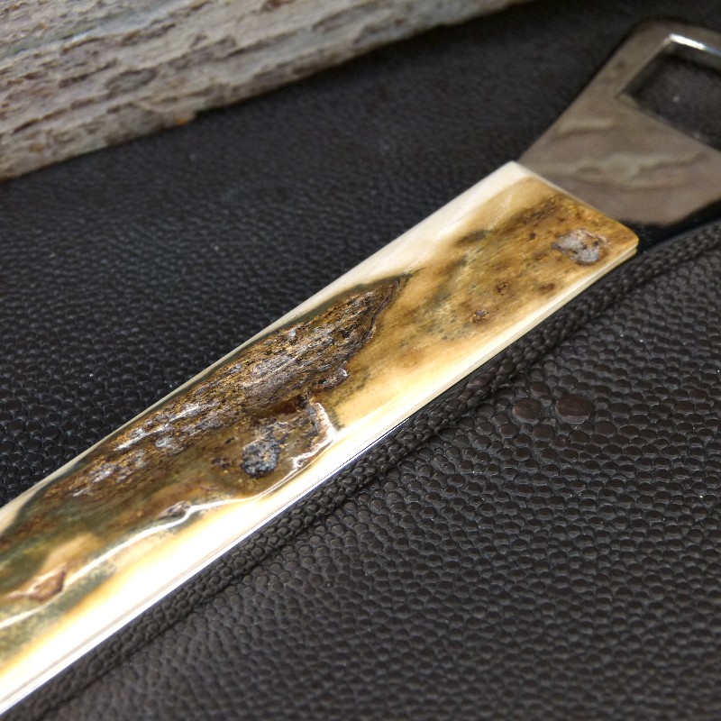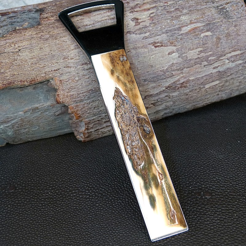 Flaschenöffner/Kapselheber aus silberfarbigem Metall, "Made in Solingen", belegt mit fossilem Mammutelfenbein mit schöner Rindenfärbung.