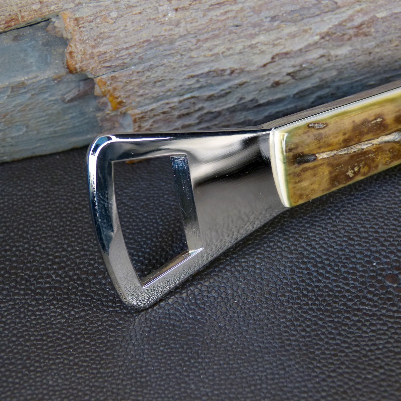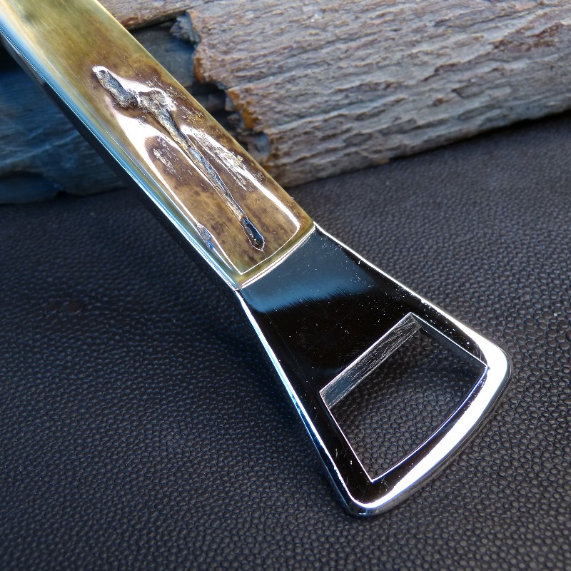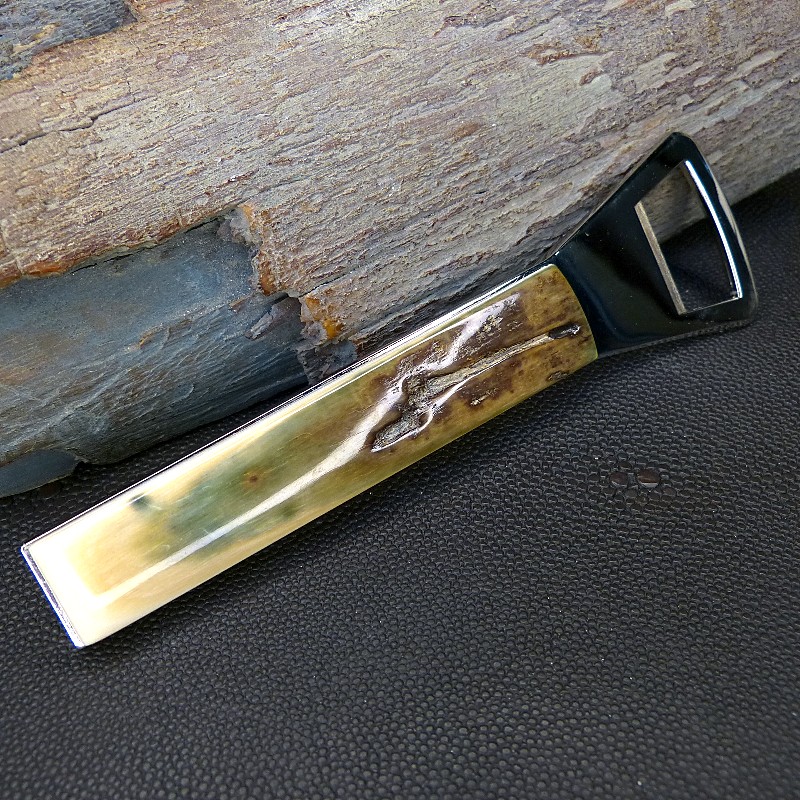 Flaschenöffner/Kapselheber aus silberfarbigem Metall, "Made in Solingen", belegt mit fossilem Mammutelfenbein mit toller seltener Rindenfärbung.