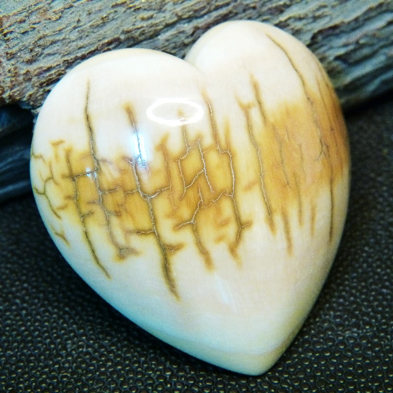 Herz aus fossilem Mammut-Elfenbein mit schöner natürlicher Rindenfärbung als Handschmeichler oder Dekostück und kann alternativ auch gerne als Anhänger umgearbeitet werden.