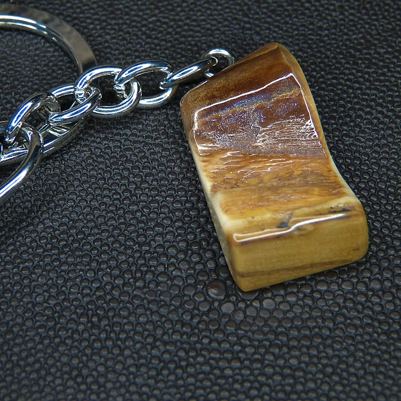 Schlüsselanhänger aus cremigem Mammut-Elfenbein mit natürlicher Bruchkante und brauner Färbung mit schöner Maserung.