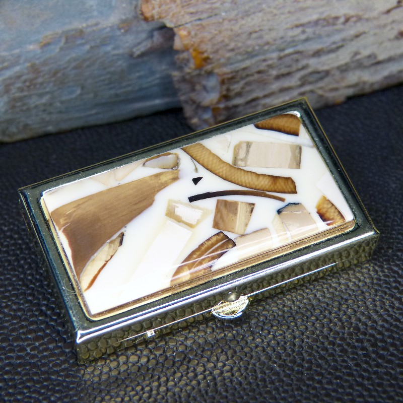 Hartvergoldete Pillendose mit 2 Fächern, belegt mit einer Platte aus cremefarbenem und braunem Mammutmosaik.