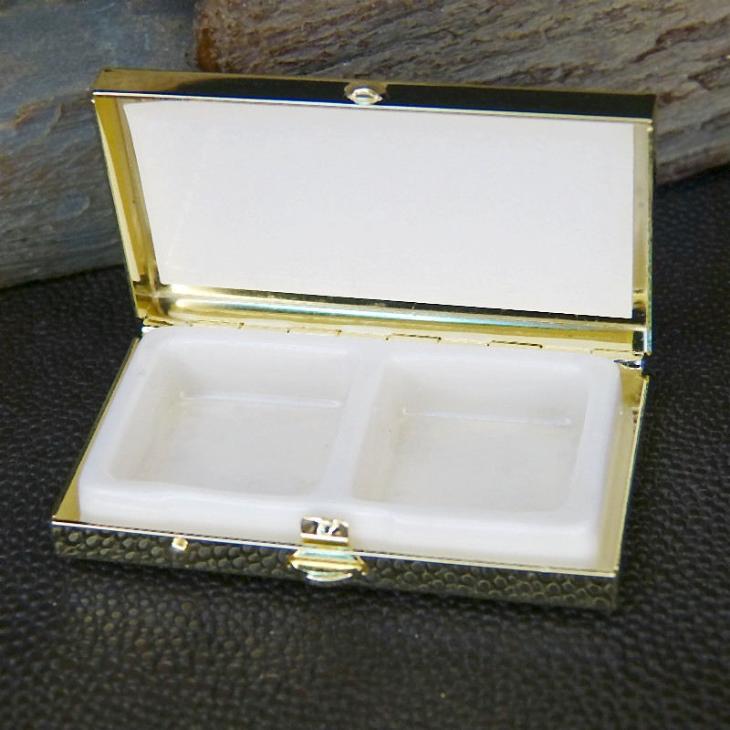 Die Dose hat eine Gesamtgröße von ca. 55 x 32 x 12 mm und bietet zwei getrennte Fächer für Pillen und Tabletten.