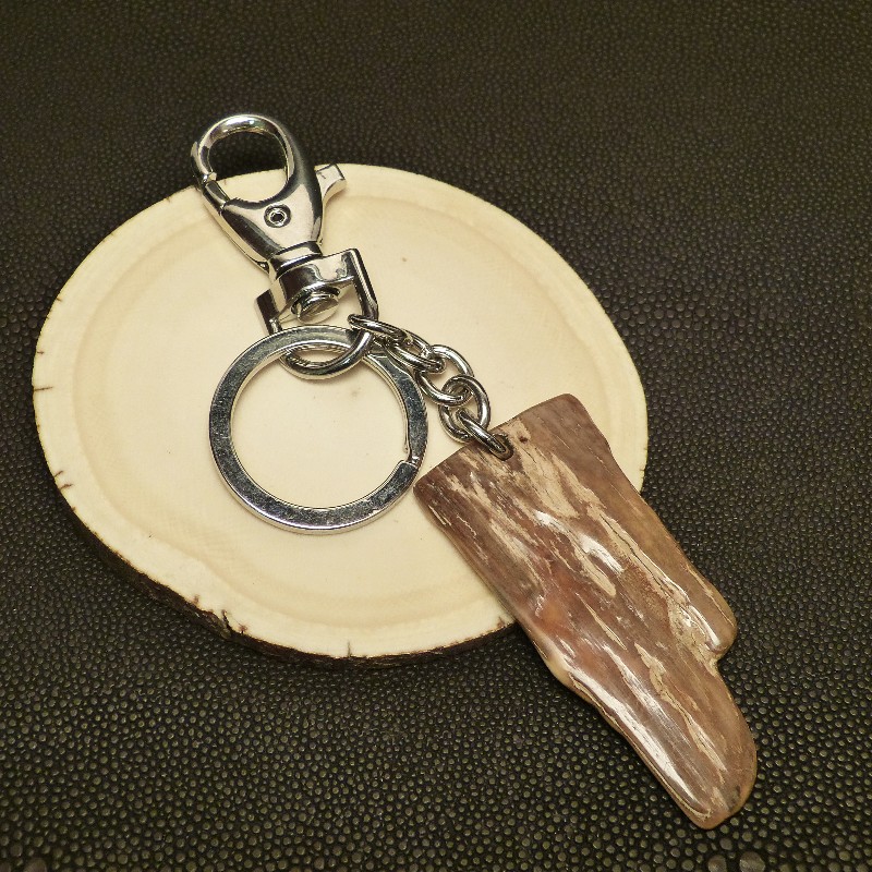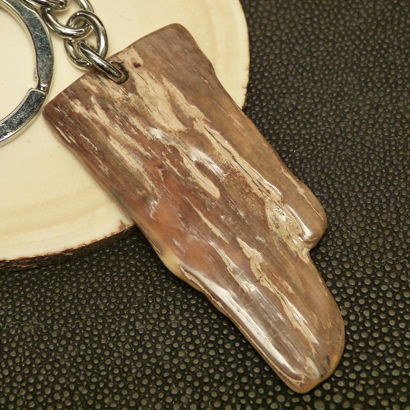 Schlüsselanhänger, gefertigt von der Außenseite eines fossilen Mammut-Stoßzahns mit brauner Rindenfärbung. Ohne Kette hat er eine Größe von ca. 66 x 27 mm bei einer Dicke von ca. 4mm. Ein Karabiner mit massiver Kette und Schlüsselring geben sicheren Halt.