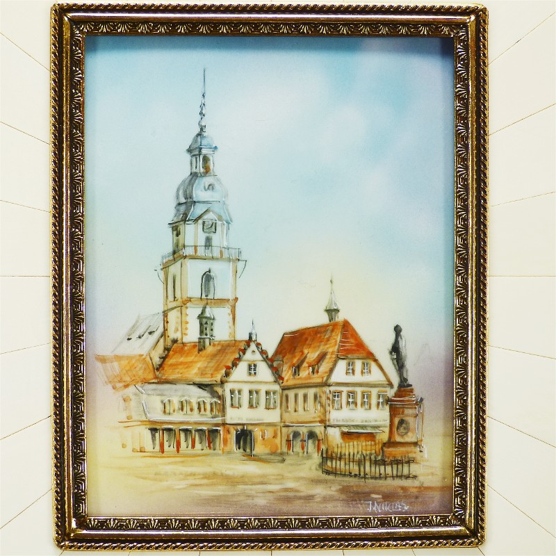 Miniatur Malerei auf fossilem Mammut-Elfenbein mit einer limitierten Auflage von nur 50 Stück. (Nr.3/50) Dargestellt wird das historische Rathaus in Erbach mit evangelischer Stadtkirche im Hintergrund, welches auf einer hauchdünnen Platte aus fossilem Mammut-Elfenbein gemalt wurde. Das Gemälde selbst wird durch einen fein verzierten Metallrahmen vom Passepartout aus Mammut-Elfenbein getrennt. Die strahlenförmige Anordnung der einzelnen Mammut-Plättchen wird durch einen hochwertigen Rahmen mit 22-karätiger Blattvergoldung ergänzt.