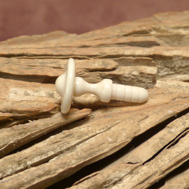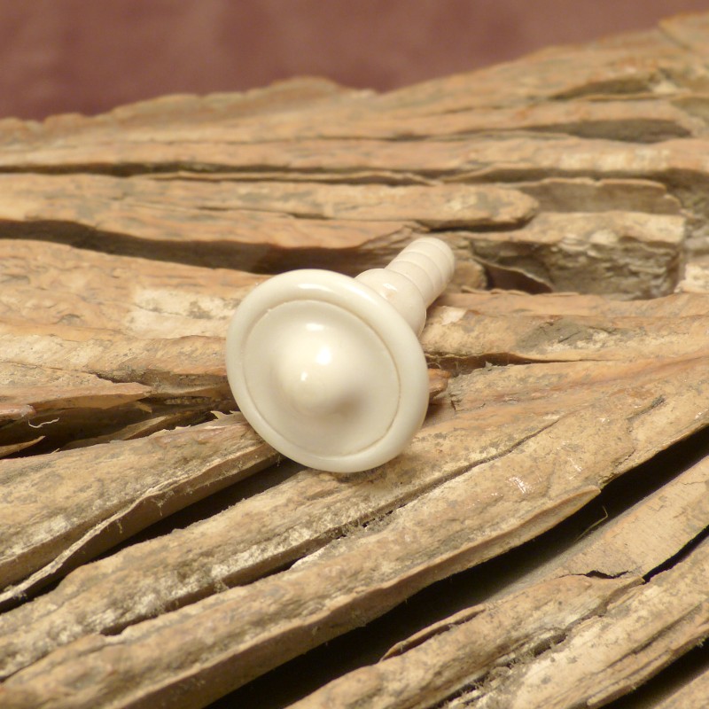 Möbelknopf aus Bein (Knochen) mit gewellter Oberfläche und einem Durchmesser von ca. 17 mm. Der einzuklebende, gerillte Schaft hat eine Länge von ca. 11mm und einen Durchmesser von ca. 5mm. Die anschließend sichtbare Länge beträgt ca. 17mm. Der Knopf ist aus zwei Teilen gefertigt und geklebt und kann für Knochen typische Strukturen und Färbungen aufweisen.
