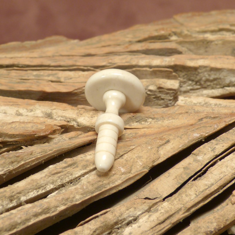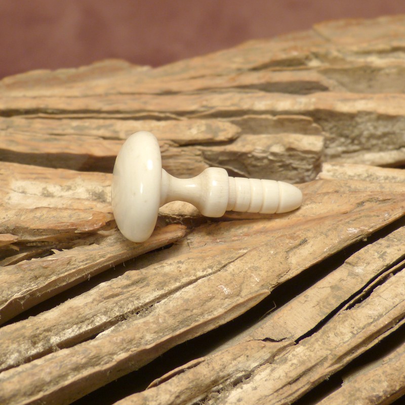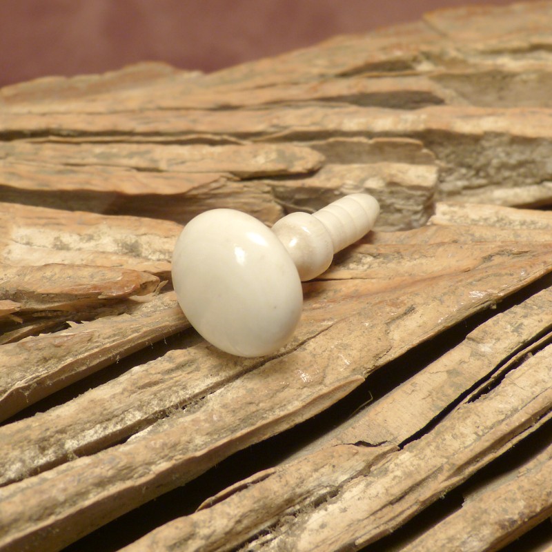 Möbelknopf aus Bein (Knochen) mit glatter Oberfläche und einem Durchmesser von ca. 16 mm. Der einzuklebende, gerillte Schaft hat eine Länge von ca. 11mm und einen Durchmesser von ca. 5mm. Die anschließend sichtbare Länge beträgt ca. 16mm. Der Knopf ist aus zwei Teilen gefertigt und geklebt und kann für Knochen typische Strukturen und Färbungen aufweisen.