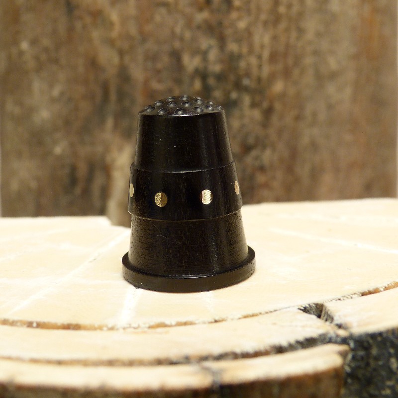 Aus Ebenholz gefertigter Fingerhut mit 8 polierten Messing-Intarsien. Höhe ca. 27 mm, Durchmesser ca. 21 mm.