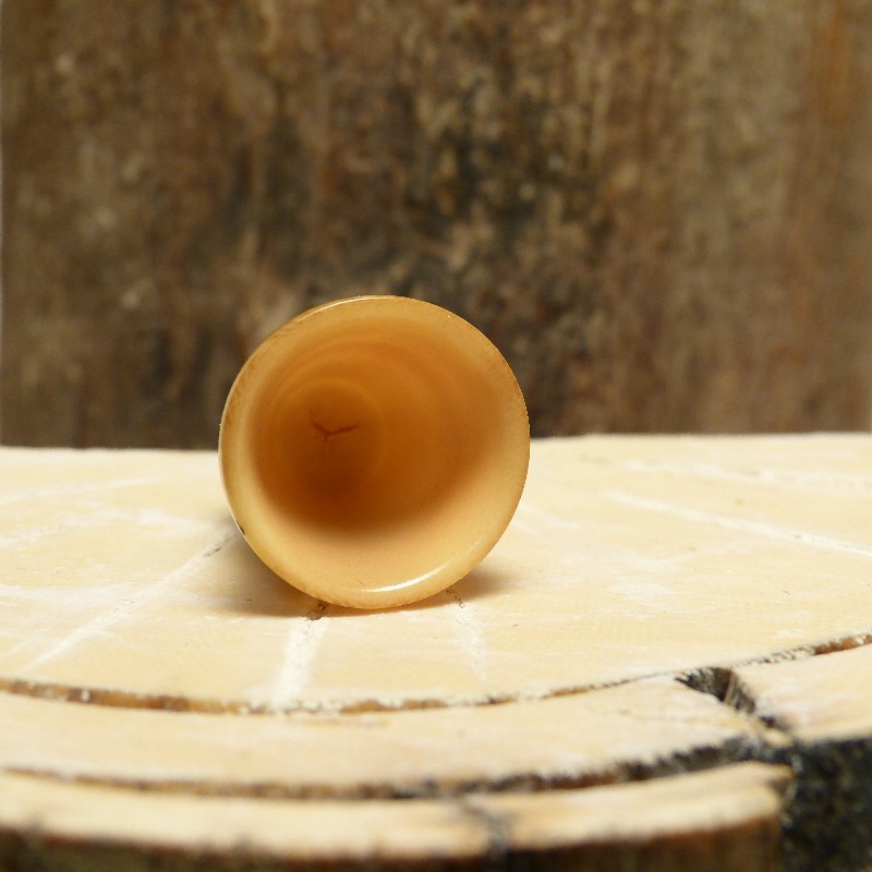 Gerillter Fingerhut aus einer Tagua-Nuss gefertigt die anschließend gebeizt wurde. Die Tagua-Nuss, auch vegetabiles Elfenbein oder auch Steinnuss genannt, stammt von einer Palmenart in Südamerika oder auch aus Afrika. Dort werden sie schon seit Jahrhunderten als Ersatz für tierisches Elfenbein verarbeitet. Das Material lässt sich sehr gut drechseln, wobei im Inneren durch Trockung in der Regel immer ein kleiner Hohlraum entstanden ist.