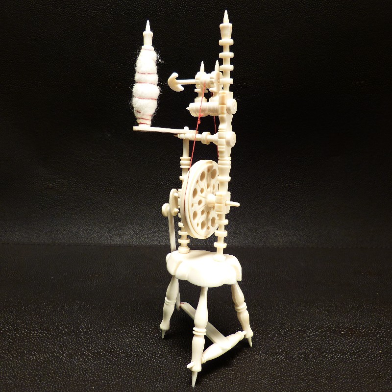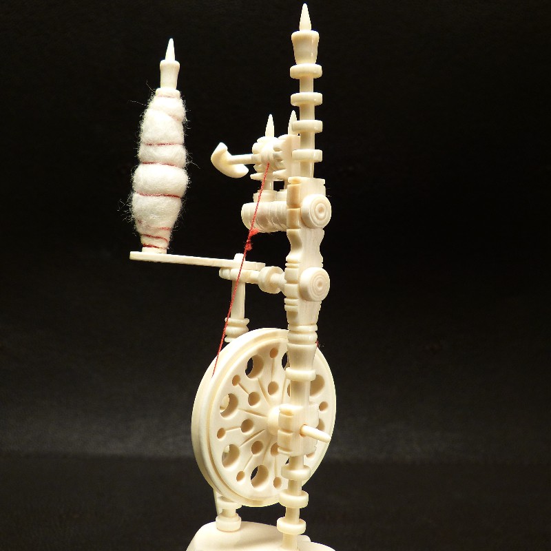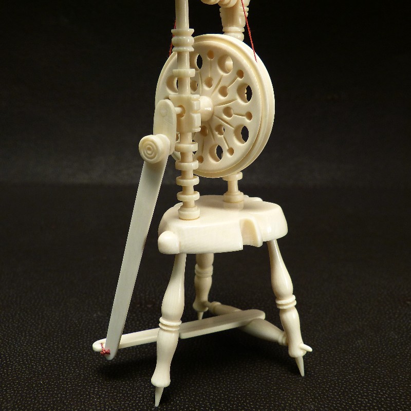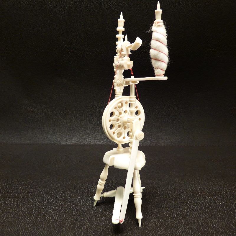 Von Hand gedrechseltes Spinnrad, bestehend aus insgesamt 25 einzeln angefertigten Mammutteilen mit einer Gesamthöhe von ca. 16 cm. Sowohl das Fußpedal, das Rad und die Spindel sind beweglich gelagert.