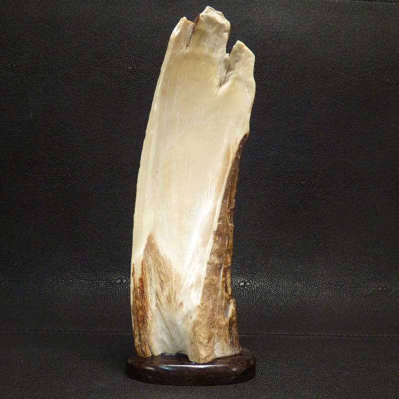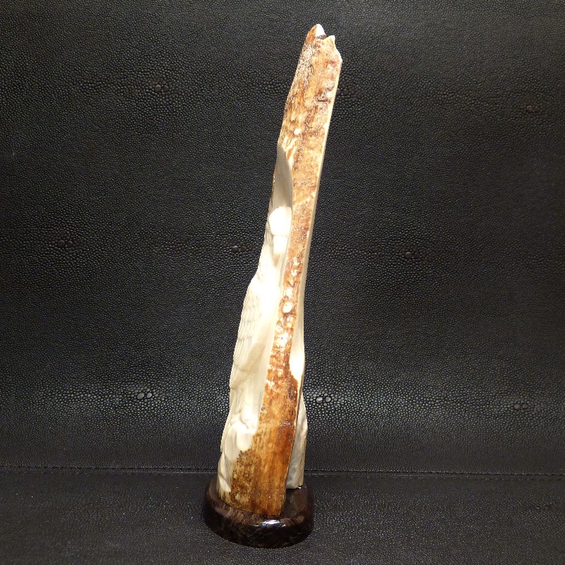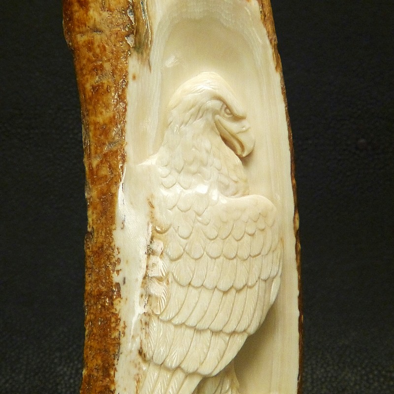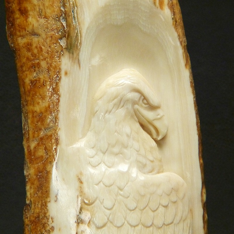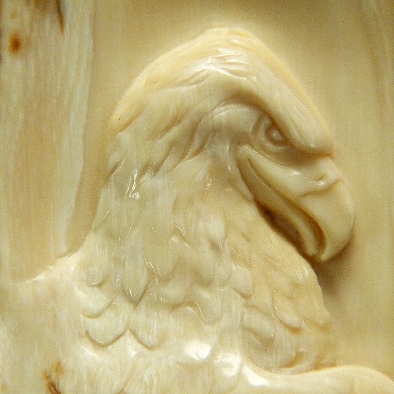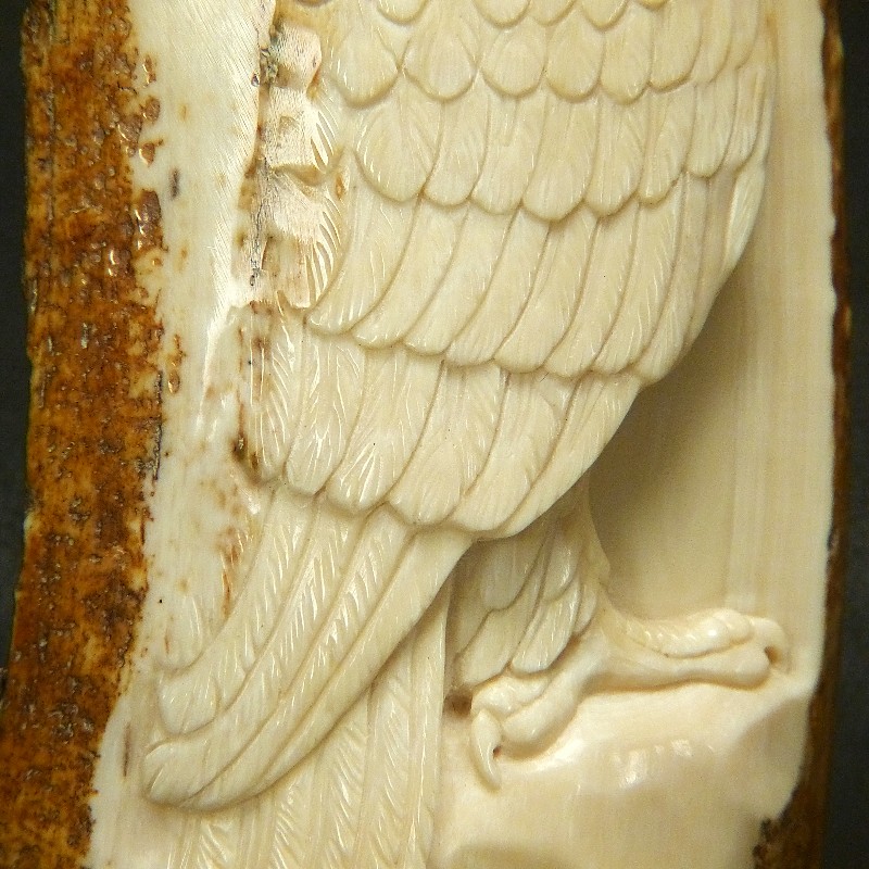 Tolle Reliefarbeit eines fein ausgearbeiteten Adlers mit naturalistischer Darstellung, geschnitzt in ein fossiles Rindenstück eines Mammut-Stoßzahns mit brauner Färbung.