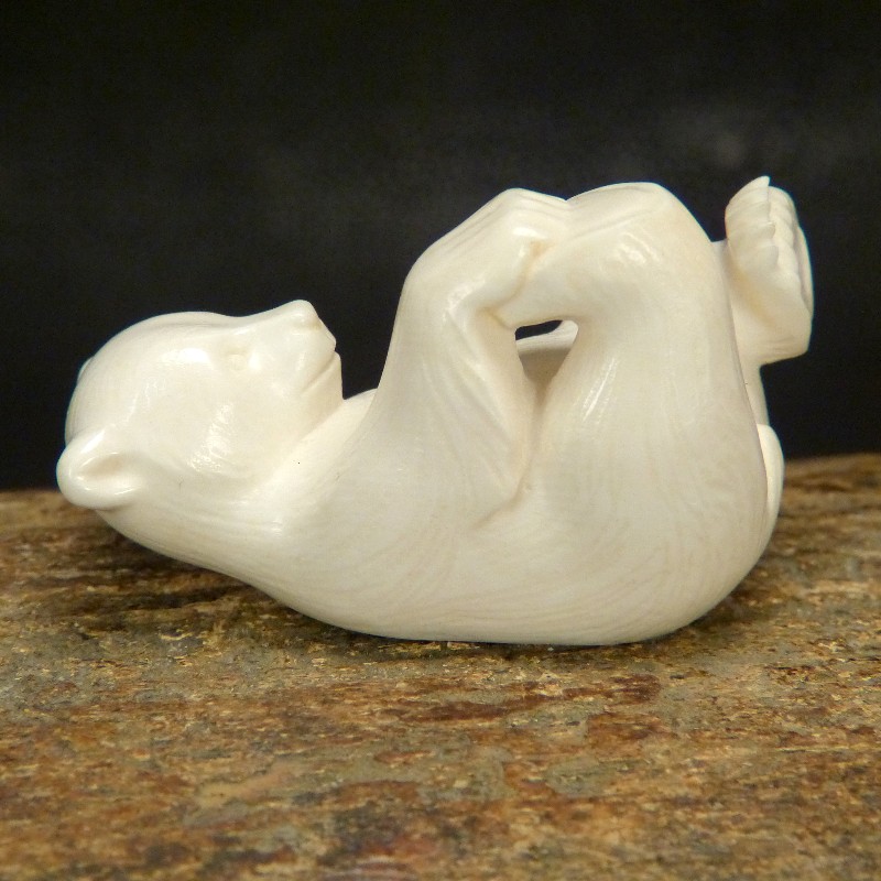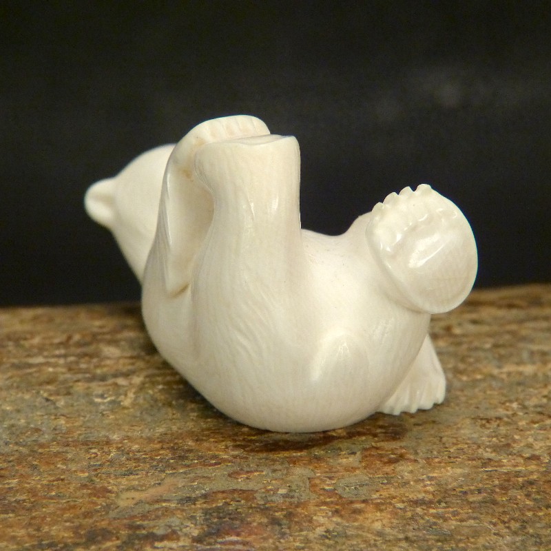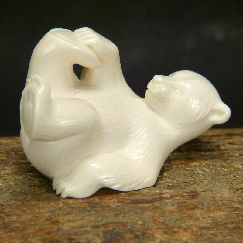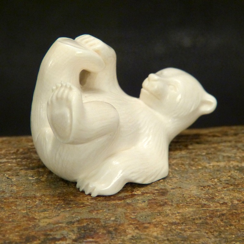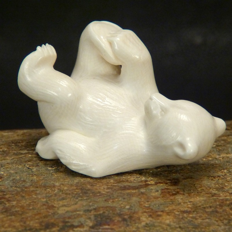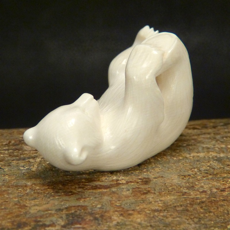 Schöne Darstellung eines auf dem Rücken liegenden Bären, geschnitzt aus hellem Mammut-Elfenbein mit feiner Maserung. Diese Qualität stammt aus dem blanken Eis und wird nur zu etwas 10 % gefunden. Anders als Material aus gefrorener Erde zeigt dieses Material keine Verfärbungen durch mineralische Ablagerungen.