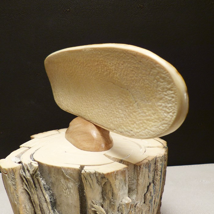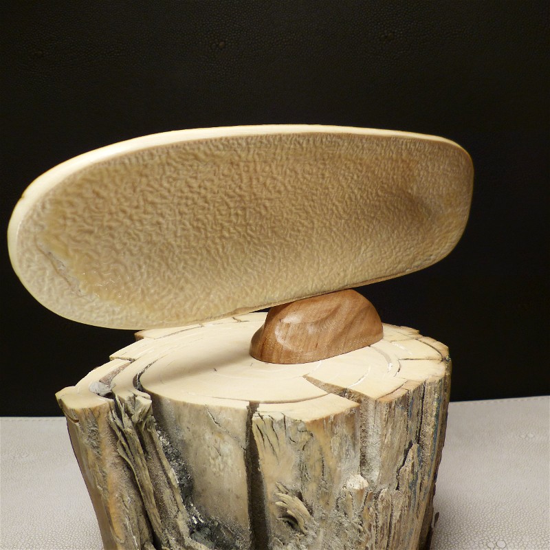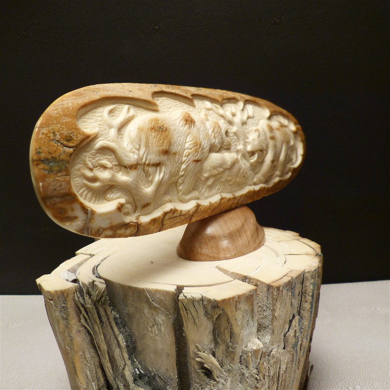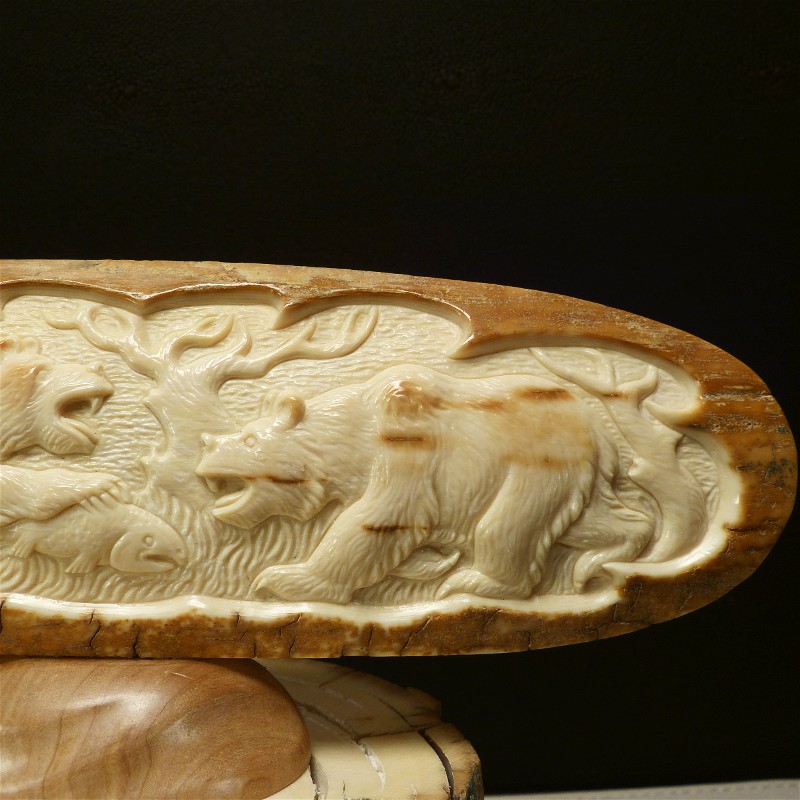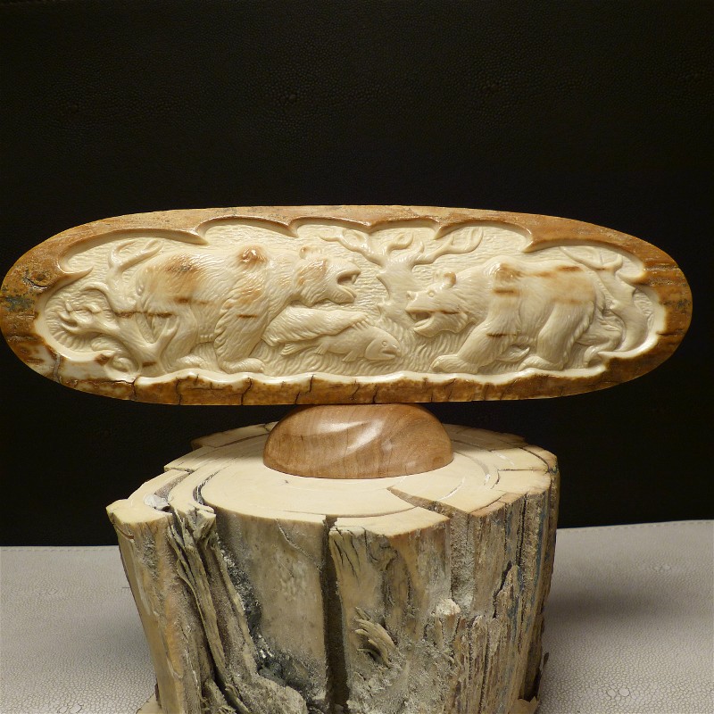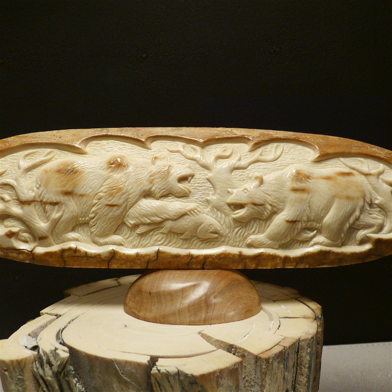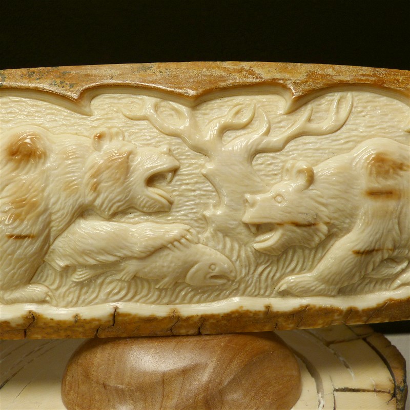 Aus brauner Mammut-Rinde geschnitztes Bärenrelief mit einer Breite von ca. 22,5 cm und inklusive Holzsockel einer Höhe von ca. 8,4 cm. Die Darstellung zeigt zwei kämpfende Bären mit Lachs, wobei durch die reliefartige Ausarbeitung ein schöner Kontrast zwischen der braunen Außenfärbung und dem inneren, hellen Material entstand.