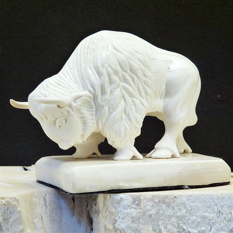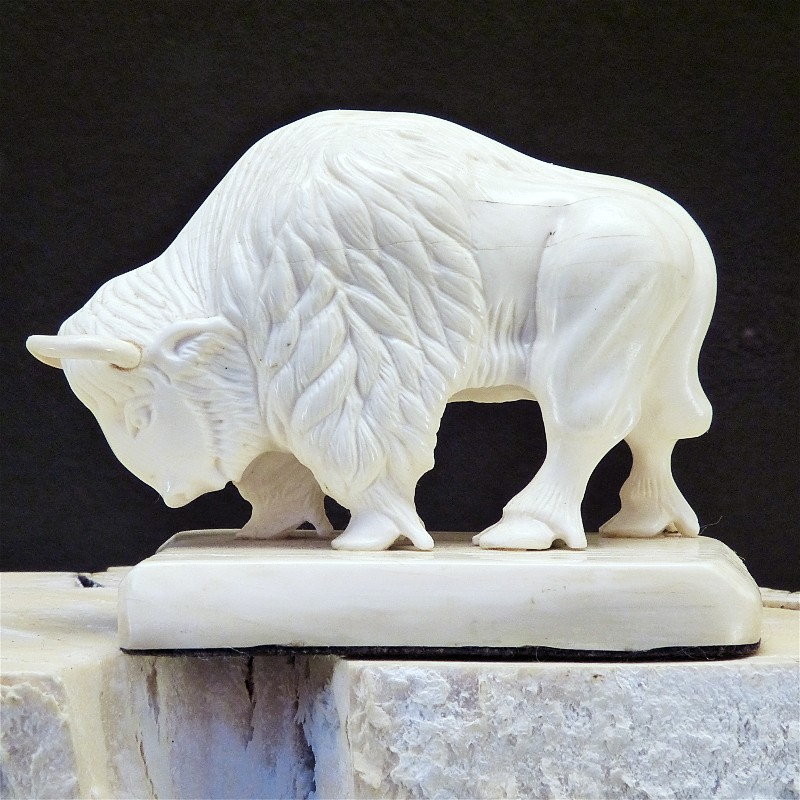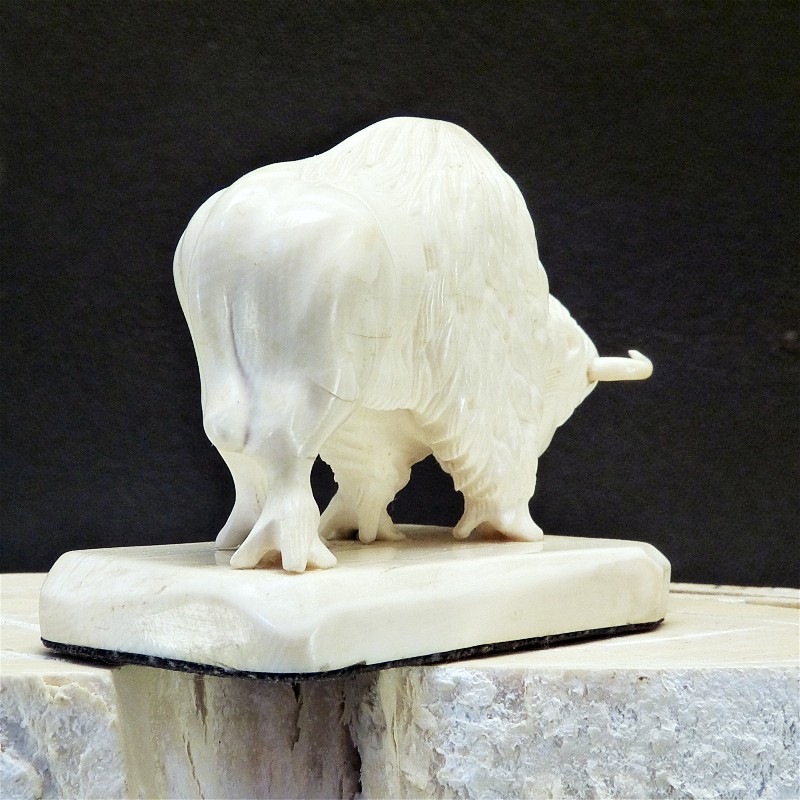 Fein geschnitzter Bison aus hellem Mammut-Elfenbein mit eingesetzten Hörnern und auf einer Mammut-Platte montiert.