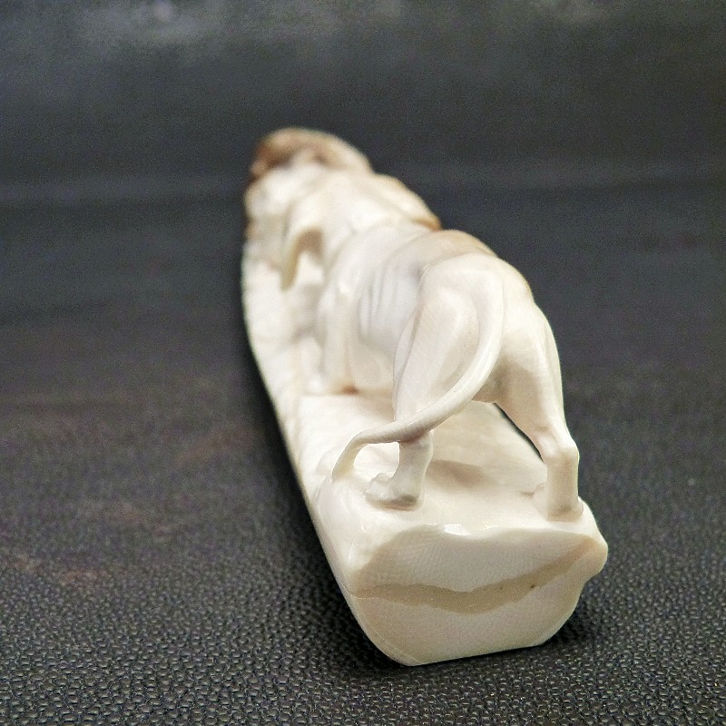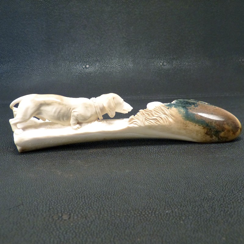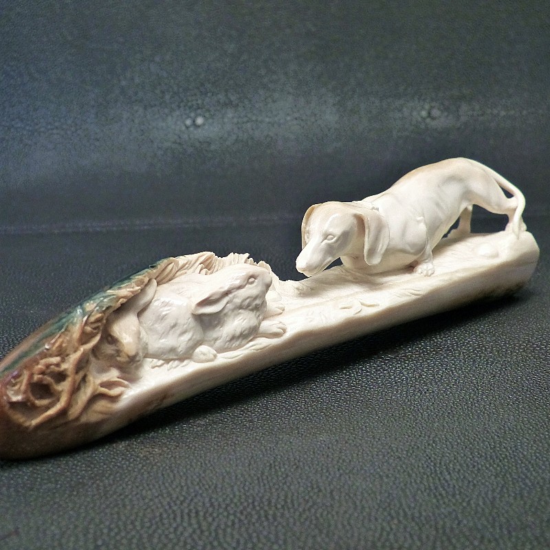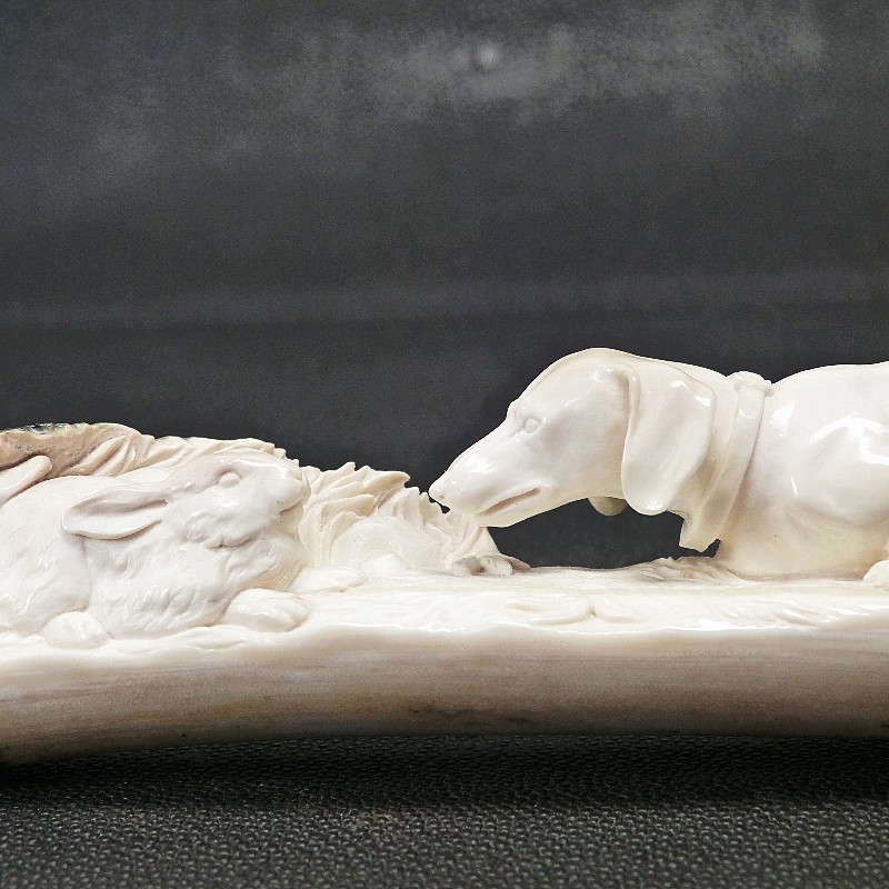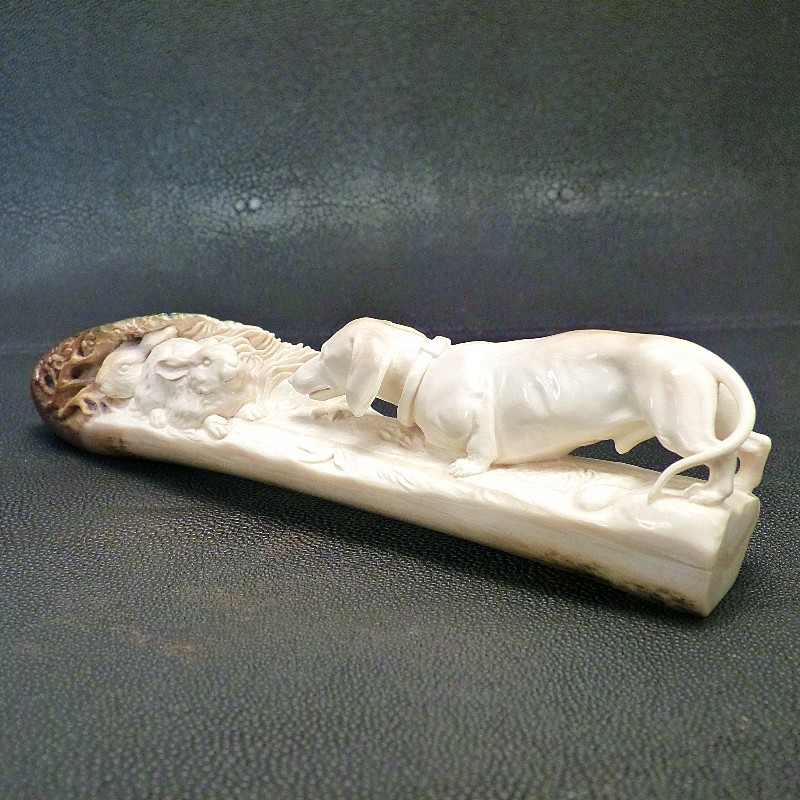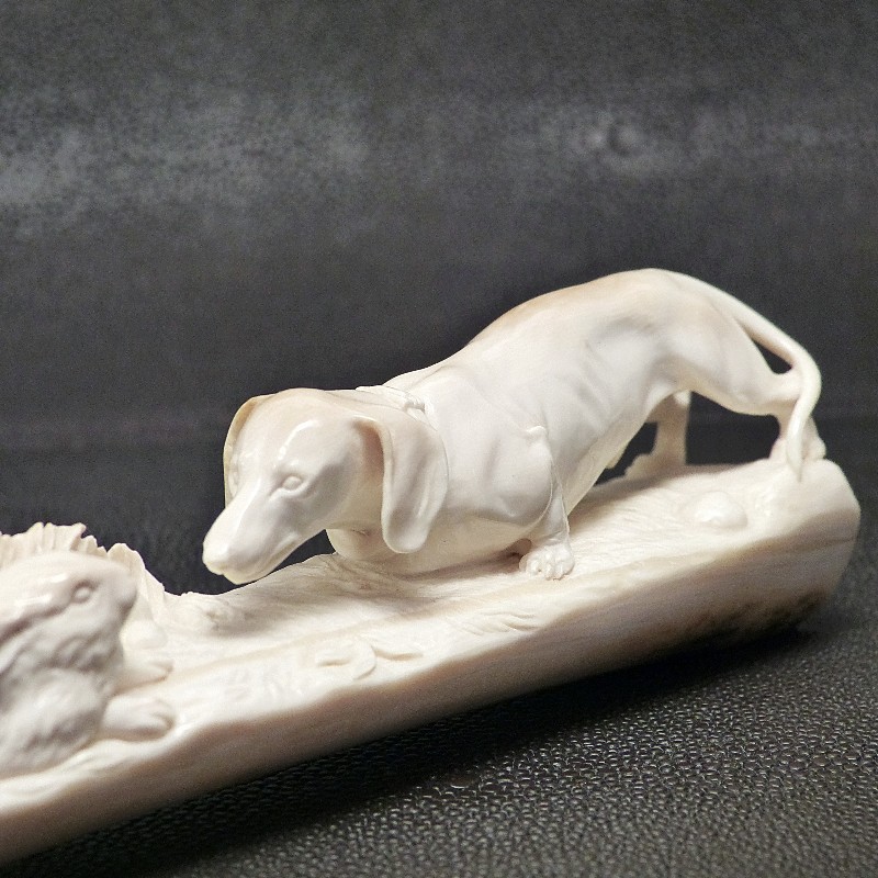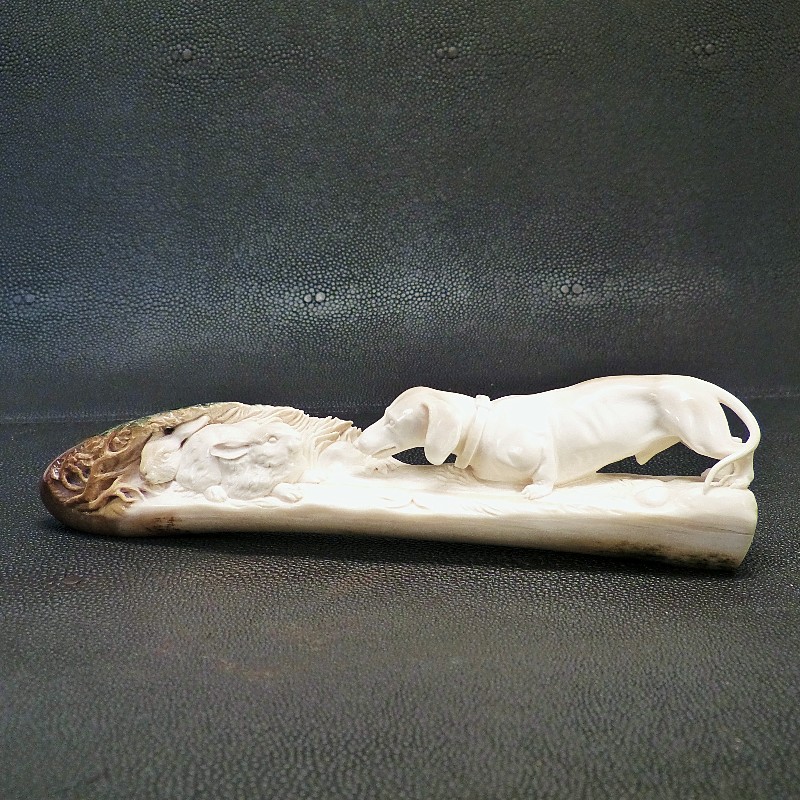 Meisterliche Darstellung eines Dackels mit zwei Hasen im Bau, geschnitzt aus einer schön verfärbten Zahnspitze eines kleinen fossilen Mammut-Stoßzahns. Mineralische Ablagerungen zeigen hier das ganze Farbspektrum von cremig-hell bis dunkelbraun, teils sogar mit dunkelblauen Schattierungen durch den Einfluss von Vivianit.