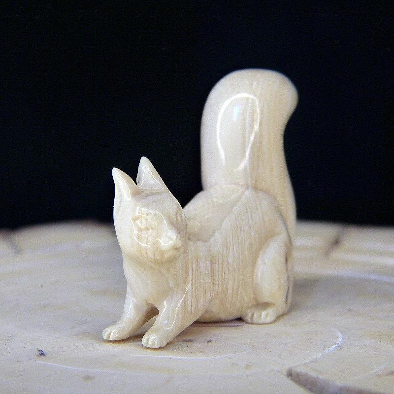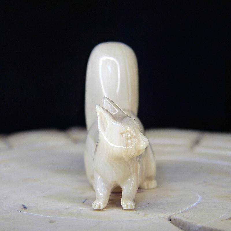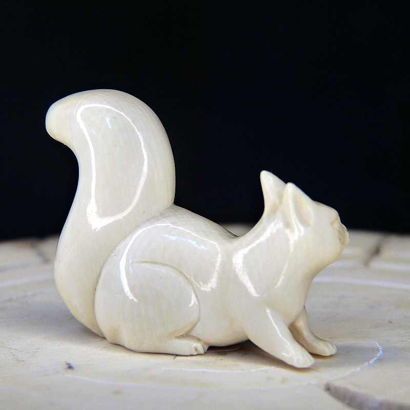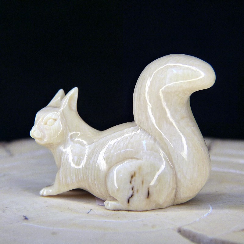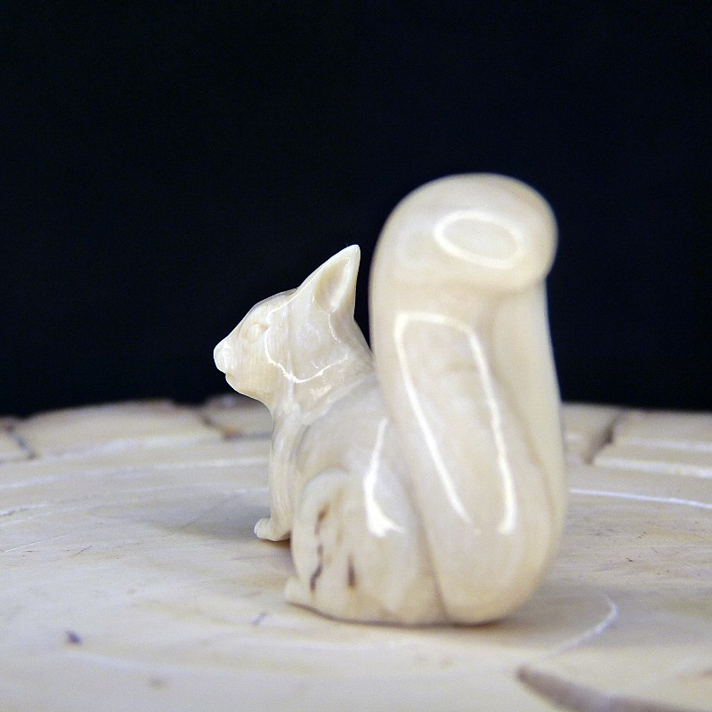 Kleines Eichhörnchen aus Mammut-Elfenbein mit feiner Maserung und Zahnschmelz.