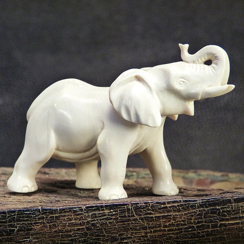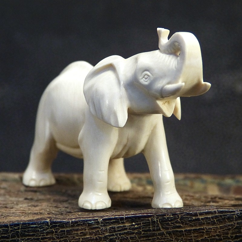 Detailliert geschnitzter Elefant aus einem hellcremigem massivem Stück Mammut-Elfenbein mit feiner Maserung und leichten Wasserflecken.