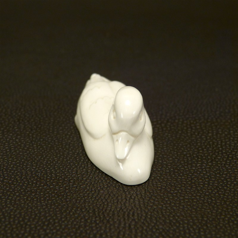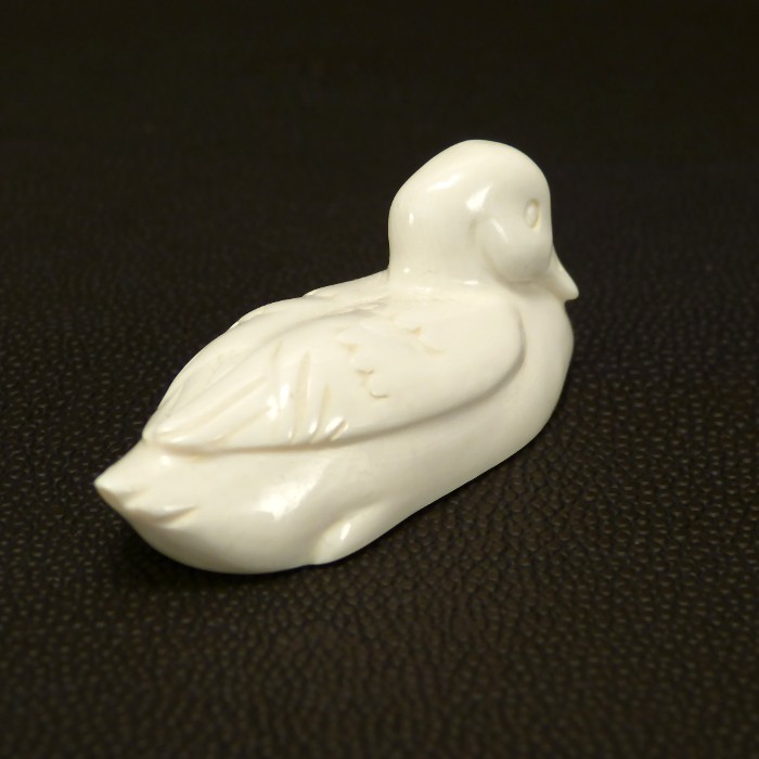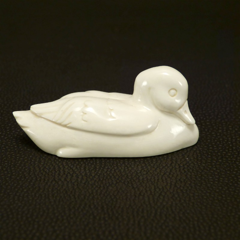 Fein geschnitzte Ente aus hellem Mammut-Elfenbein mit feiner Maserung. Sie hat eine Länge von ca. 54mm. Die Breite misst ca. 20mm, die Höhe ca. 23mm.
