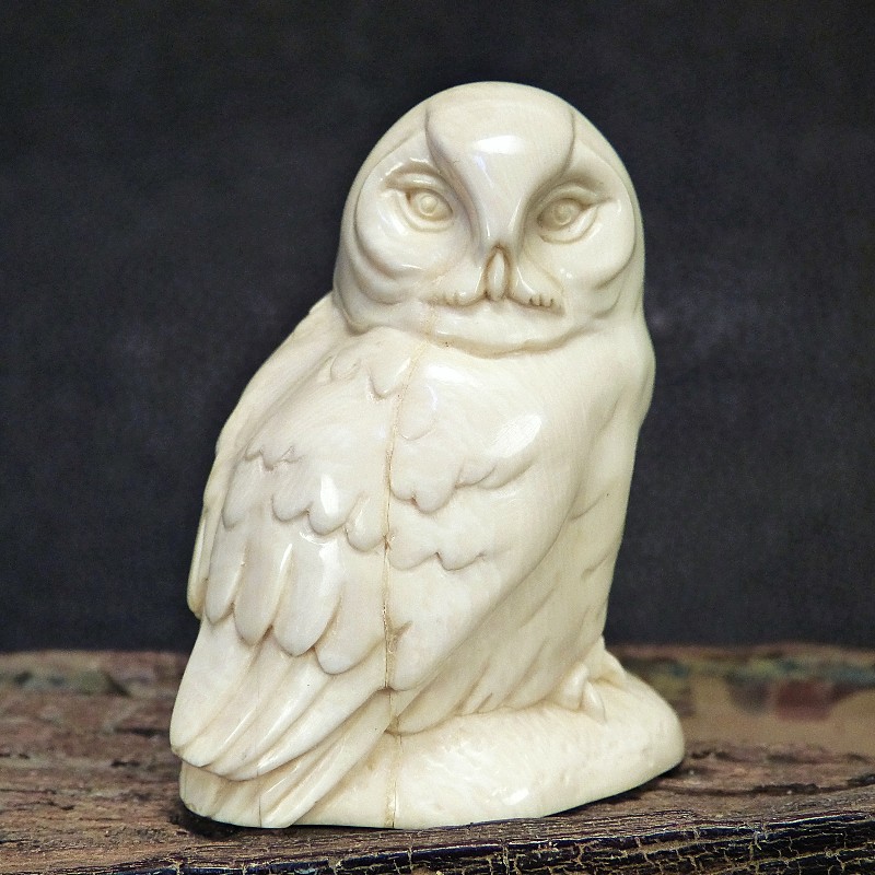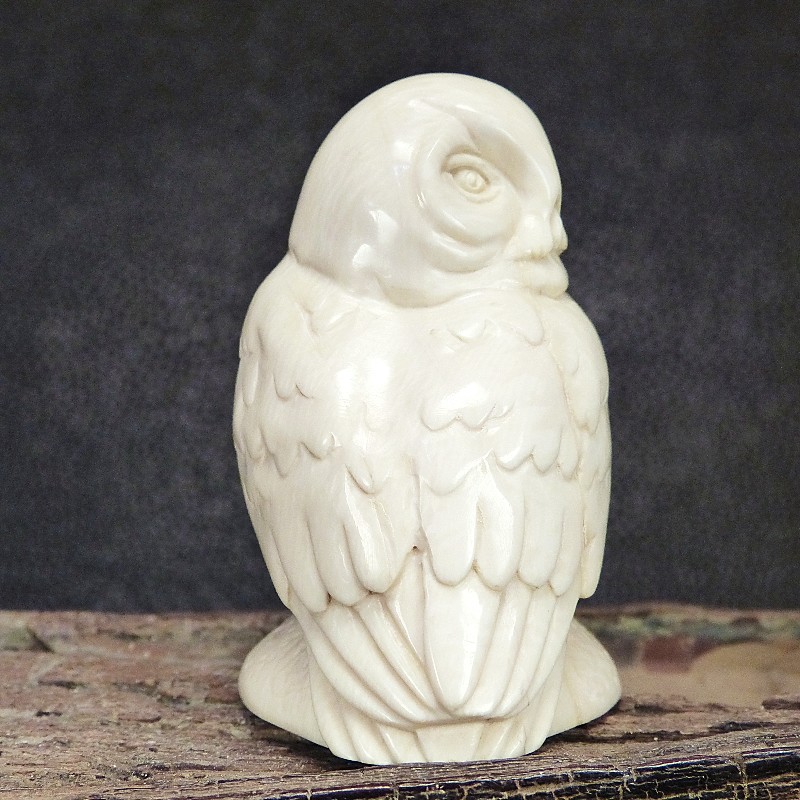 Diese Eule wurde aus einem Stück nahe des Kerns aus einem cremefarbenem Mammutzahns geschnitzt.
