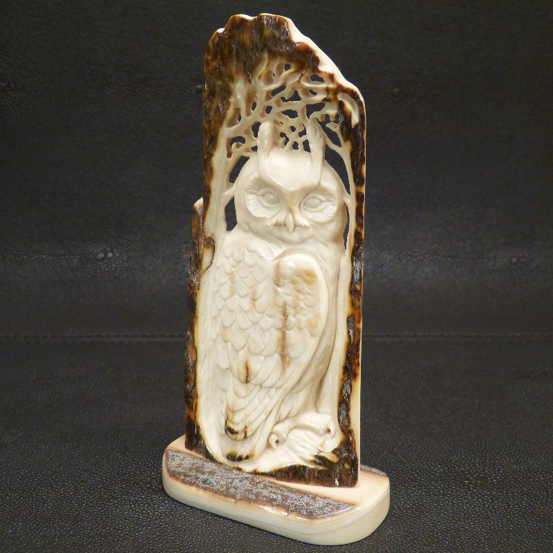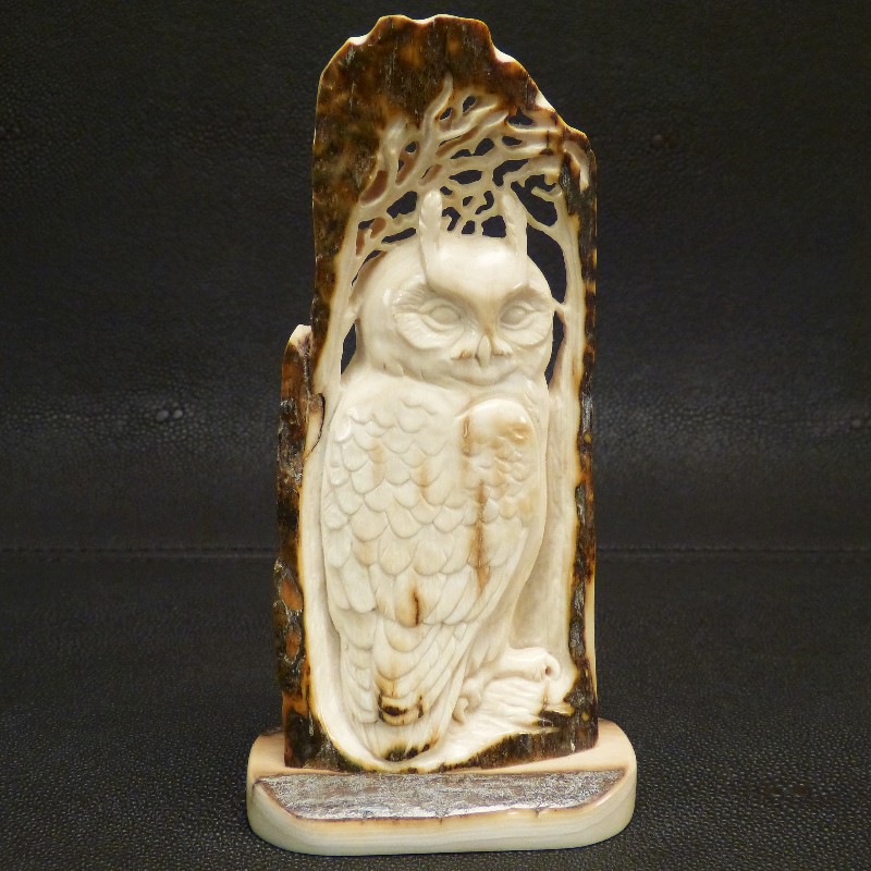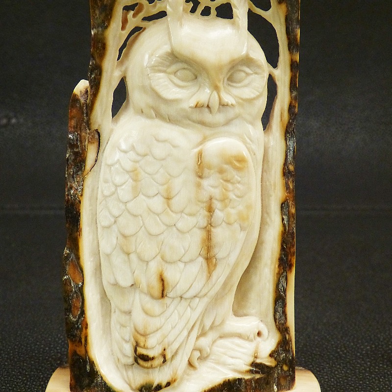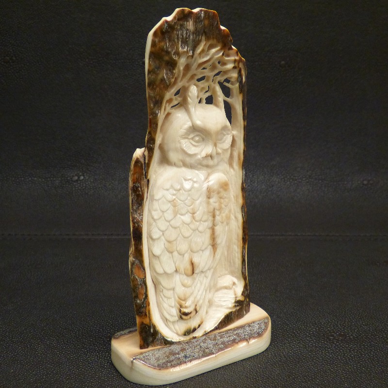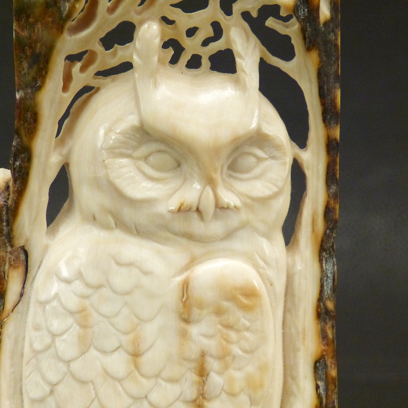 Detailliert geschnitztes Eulenrelief mit Durchbrucharbeiten, gefertigt aus dem Rindenstück eines Mammut-Stoßzahns mit schöner bräunlicher Färbung.