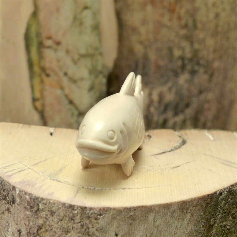 Fein geschnitzter Fisch aus leicht cremefarbenem Mammut-Elfenbein mit feiner Maserung und dunkler Färbung auf der einen Seite. Er hat eine Größe von ca. 49x13x23mm (LBH)