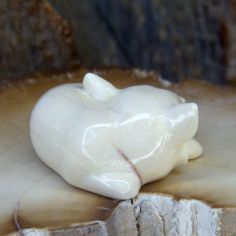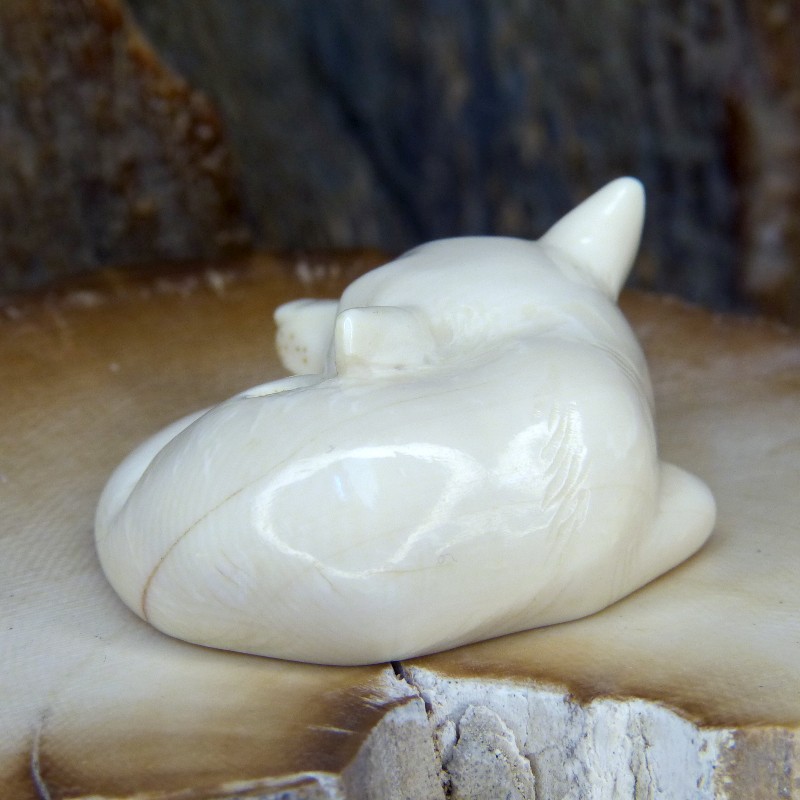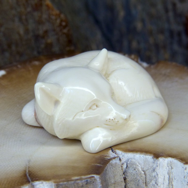 Schlafender Fuchs, geschnitzt aus hellem, fossilem Mammut-Elfenbein mit leichten Wasserflecken. Die Größe misst ca. 40 x 31 mm bei einer Höhe von ca. 18 mm.