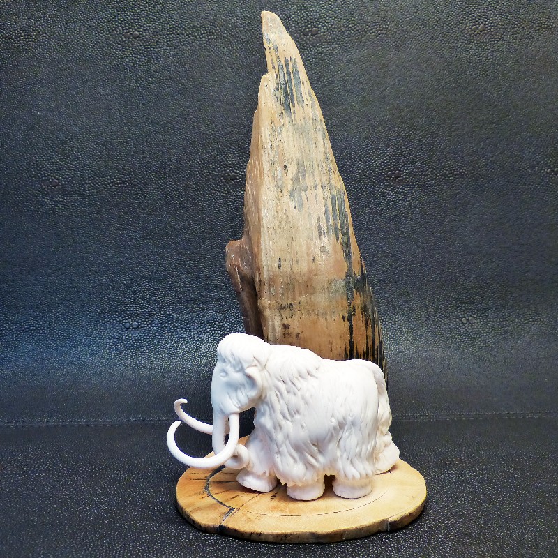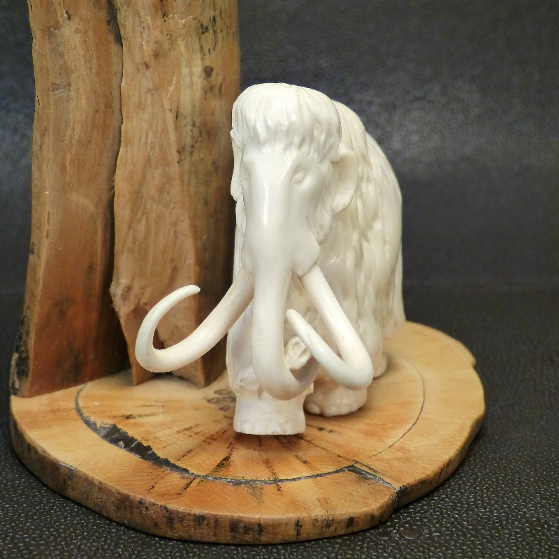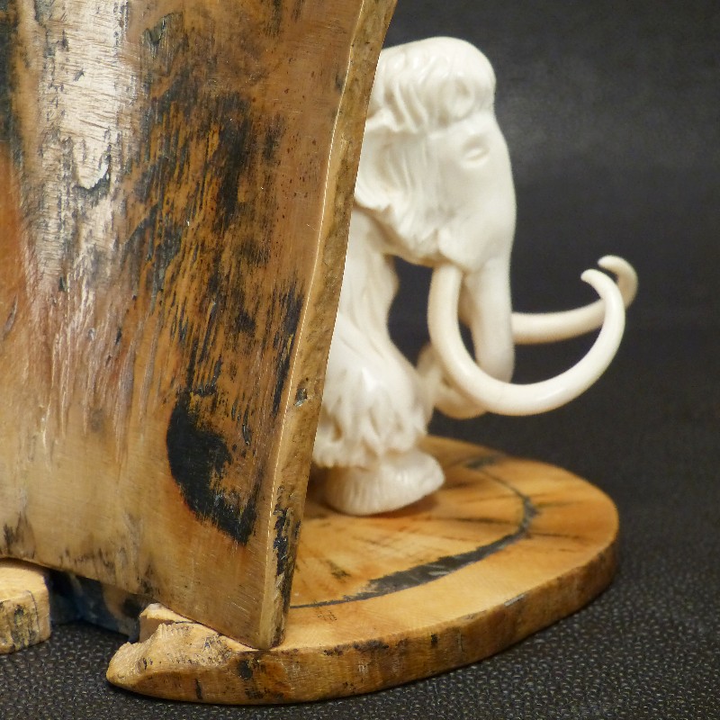 Mammutfigur, montiert auf einer Stoßzahnscheibe mit braunen Färbungen und ausgeprägter Maserung, kombiniert mit einem als Berg dargestelltem Rindenstück mit natürlicher Verwitterung.