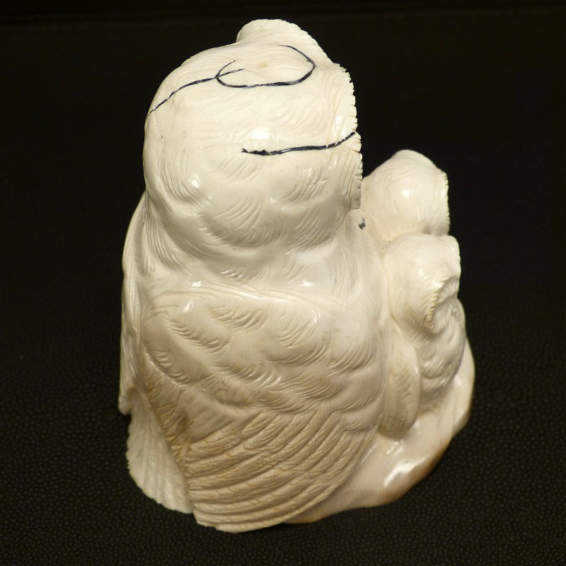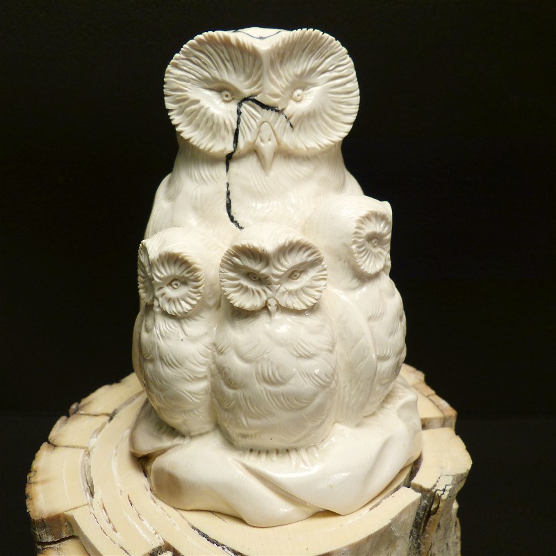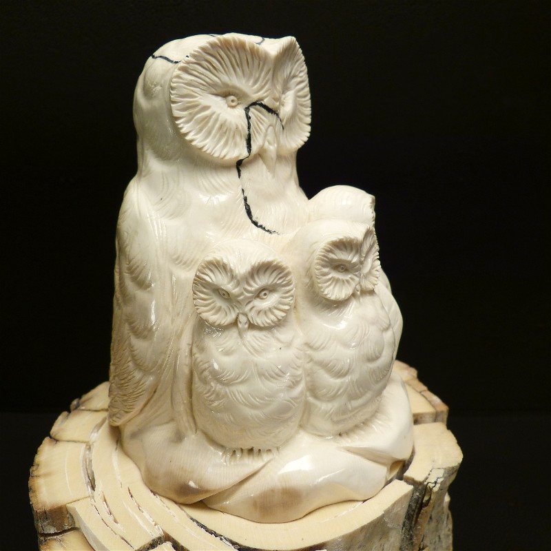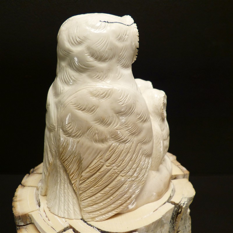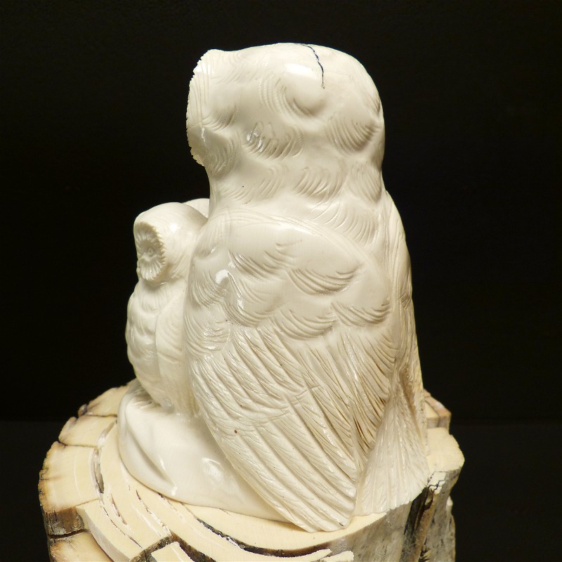Aus einem einzigen Stück gefertigte Eulengruppe aus fossilem Elfenbein. Das schwere solide Stück wurde direkt aus dem Kern eines Mammutzahns geschnitten und weißt deshalb lediglich an einem hinteren Flügel eine leichte Cremefärbung durch mineralische Ablagerungen auf.