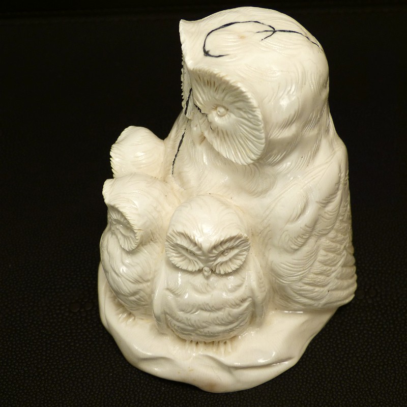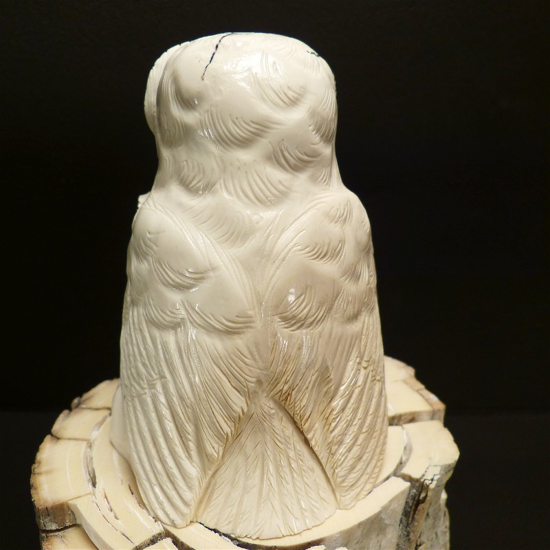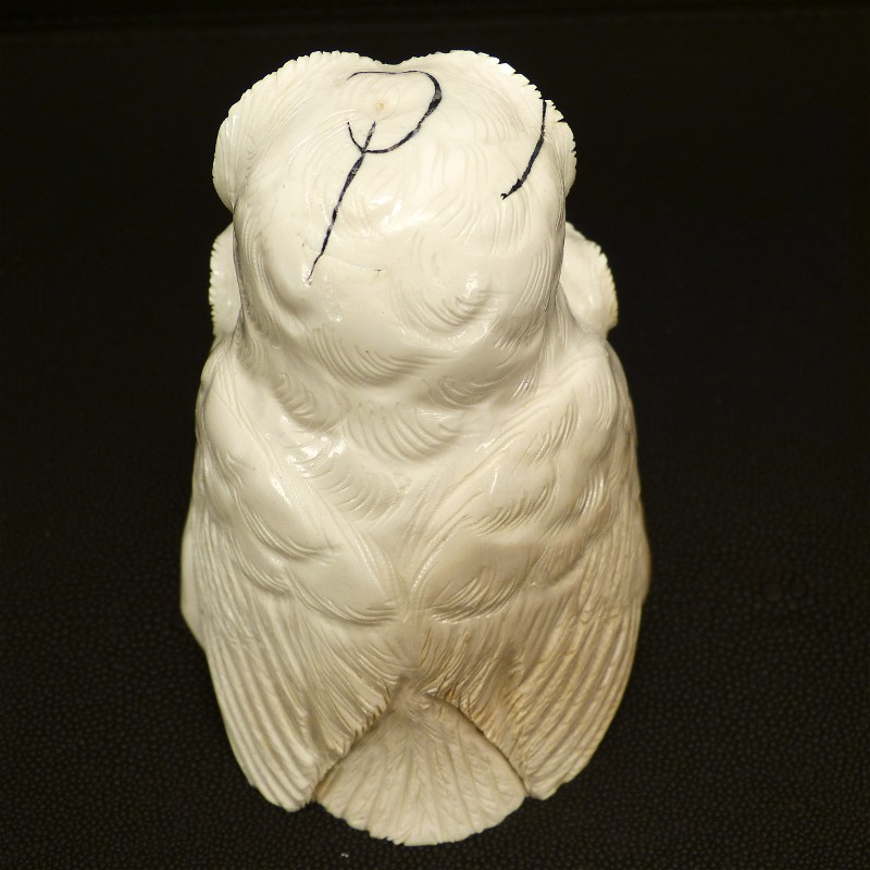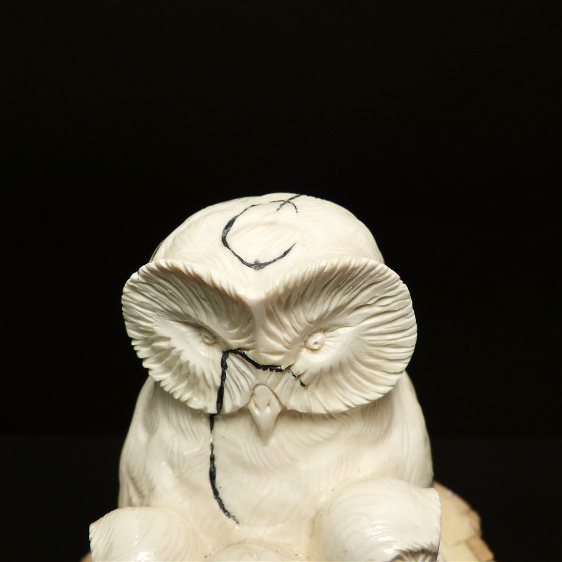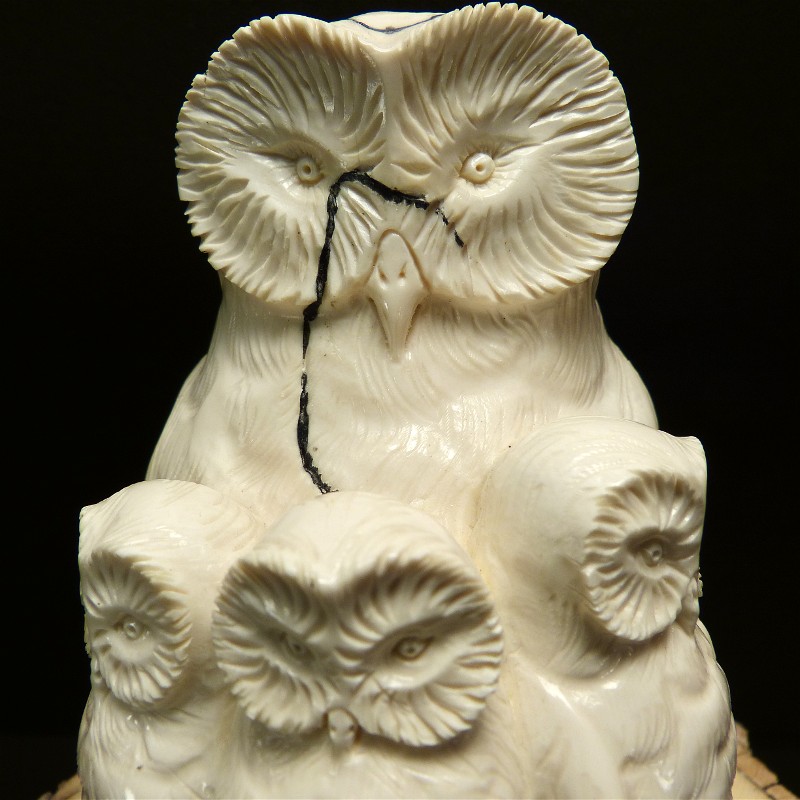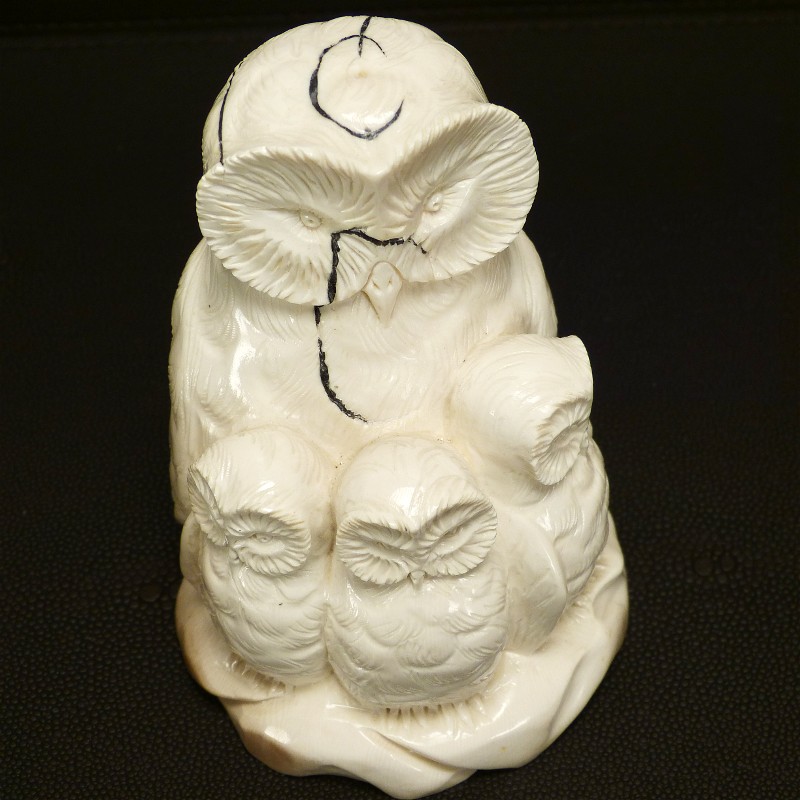Aus einem einzigen Stück gefertigte Eulengruppe aus fossilem Elfenbein. Das schwere solide Stück wurde direkt aus dem Kern eines Mammutzahns geschnitten und weißt deshalb lediglich an einem hinteren Flügel eine leichte Cremefärbung durch mineralische Ablagerungen auf.