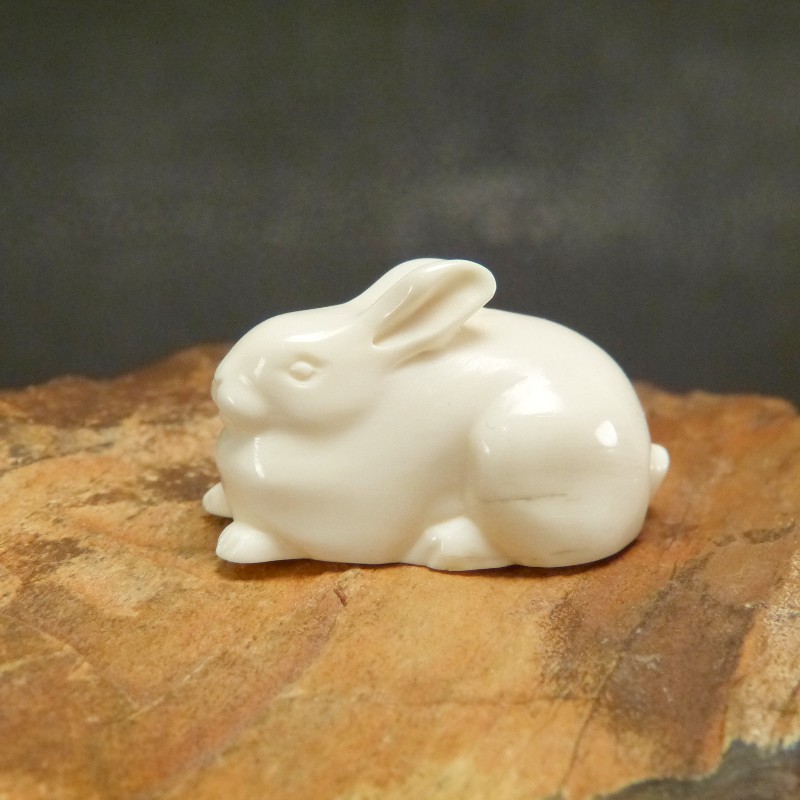 Aus fossilem Mammut-Elfenbein geschnitzter Hase mit glatter Oberfläche in einer Größe von ca. 32 x 20 x 20 mm.