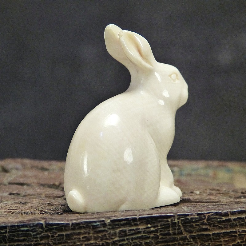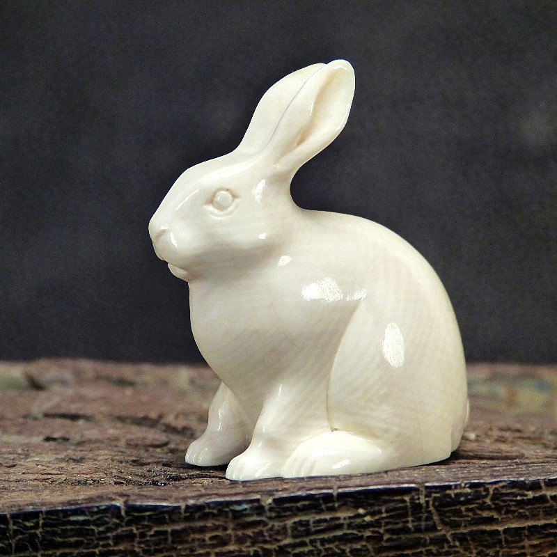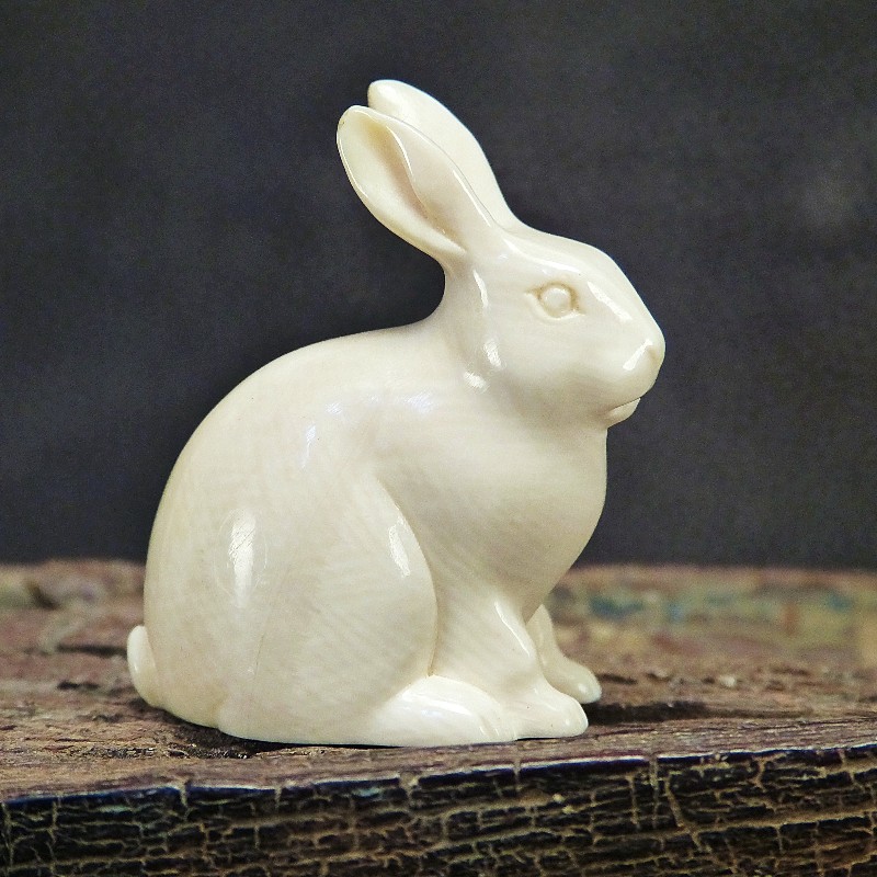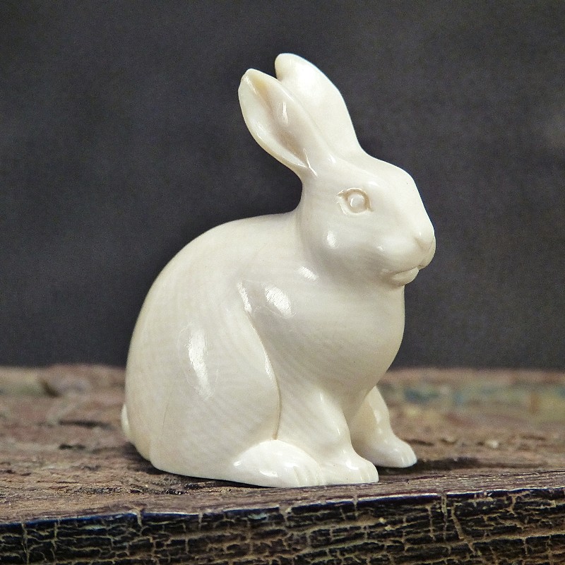 Fein geschnitzter, sitzender Hase aus cremefarbenem Mammutelfenbein mit ausgeprägter Maserung.